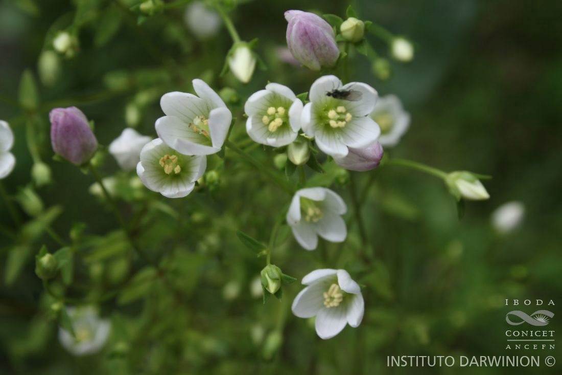 Hierba anual, erecta, grácil, de 10-55 cm de alto, tallo simple, ramoso-divaricado, con ramas desde cerca de la base o más arriba, laxamente hojosas. Hojas 3-nervadas, las basales ausentes o muy escasas, espatuladas con base atenuada, de 7-14 × 4 mm, las caulinares ovadas con base cordiforme a angosto-ovadas, agudas, de 7-20 × 3-13 mm, decrecen notablemente en longitud desde la base al ápice. Cimas laxas 2-5-floras, solitarias en las axilas foliares. Flores perfectas; pedicelos de 12-55 mm de largo, mucho más largos que las flores; cáliz de 5-8 mm de largo, tubo de 1,5-2,5 mm de largo, lóbulos linear-triangulares, agudos, hasta dos veces más largos que el tubo; corola blanca a blanco-amarillenta, de 8-15 mm de largo, glabra, lóbulos ovados, obtusos, subagudos, agudos (subespatulados en flores viejas), de 5-9,5 mm de largo, raro hasta el doble de largos que el tubo, nectarios en U, poco conspicuos; estambres con filamentos insertos cerca de la mitad inferior del tubo corolino, anteras exertas, de 1,1-1,5 × 0,5-1 mm; gineceo fusiforme, sésil o subsésil (con ginóforo de menos de 0,5 mm de largo), lóbulos estigmáticos ovados, muy papilosos. Cápsula madura más corta que la corola. Semillas elipsoideas, de 0,6-0,7 × 0,4-0,5 mm.