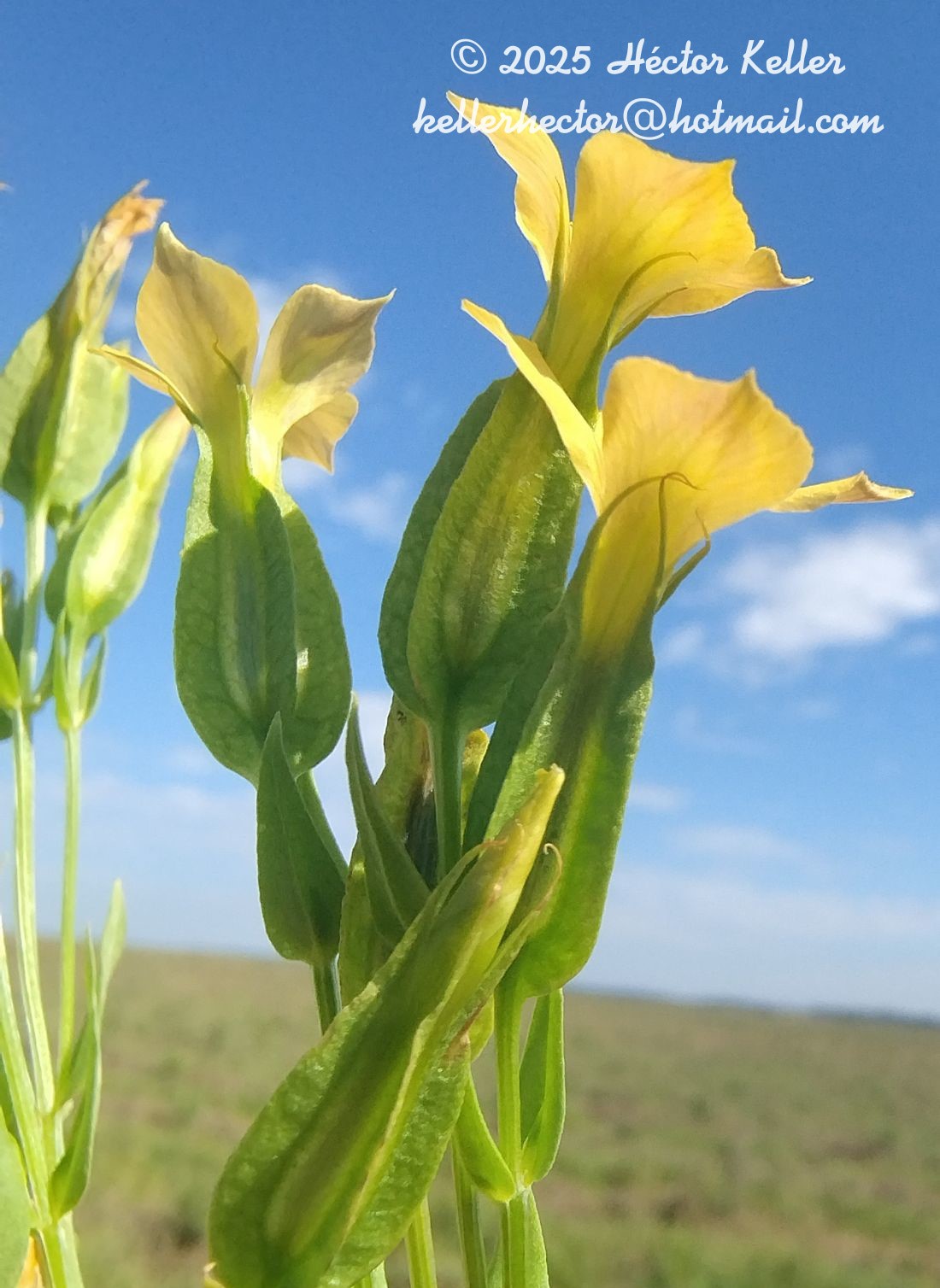 Hierbas de 17-50 cm de alto, tallos 4-costados, con finas alas plegadas en los ángulos. Hojas caulinares ovadas a angosto-ovadas, 3-nervadas, las superiores, de 12-35 × 4-18 mm, más agudas y largas que las inferiores, de 6-15 × 3-8 mm; brácteas y bractéolas aquilladas, carenadas. Inflorescencias en dicasios simples 3-floros o con dos ramificaciones o bien, flores solitarias apicales o axilares. Flores con el cáliz urceolado, 4-alado, de 15-24 mm de largo, alas retinervadas, de 1,5-2,5 mm de ancho, lóbulos ovados a subtriangulares, aleznados, más cortos que el tubo, de (5-)7-9 mm de largo; corola de (17-)20-25(-27) mm de largo, glabra, amarillo-verdosa, amarilla o rosa, con el fondo más oscuro, tubo infundibuliforme, estrechándose hacia la mitad superior, lóbulos obovados a espatulados, de 4,5-10 × 3-9 mm, apiculados, 5-nervados; filamentos estaminales insertos ca. la mitad inferior del tubo, alas sinuosas, anteras con apículo corto y grueso, de 2-3 × 1 mm, granos de polen con exina semitectada reticulada, con muros angostos; ovario un poco más largo que el estilo, lamelas estigmáticas transovadas a subcirculares, recurvadas completamente en la antesis, de 2 mm de diámetro. Cápsula con 4 costillas poco manifiestas en el 1/3 superior, completamente cubierta por el cáliz persistente. Semillas 350-450 por fruto, elipsoideas o subesféricas, subanguladas, con diámetro menor de 0,5 mm, episperma reticulado.