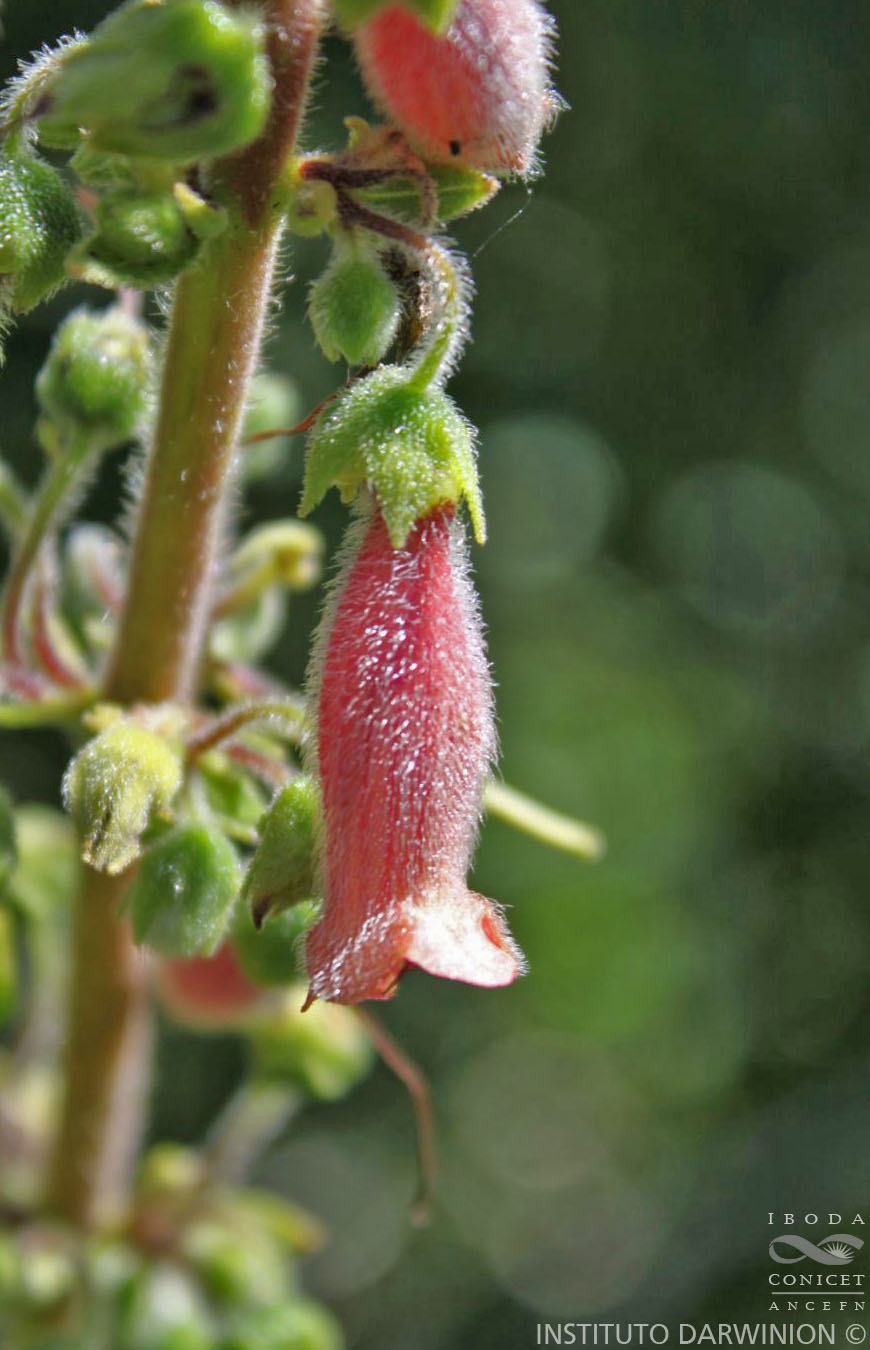 Hierbas perennes, con tubérculos hasta de 40-50 cm de diámetro. Tallos simples o a veces ramificados, erguidos, de 50- 150 cm de alto × 2-10 mm de diámetro, con pubescencia de densidad variable. Hojas opuestas o ternadas, subsésiles o con pecíolo hasta de 1 cm de largo; láminas oval-elípticas, de 3-13 × 2-6 cm, agudas en el ápice, obtusas en la base; cara adaxial con pubescencia densa; cara abaxial verde-blancuzca, con pubescencia muy densa; margen crenulado con dientes de 1-2 × 1-5 mm; 7-10 pares de nervios. Inflorescencias cimosas, 1-6-floras, dispuestas en la axila de una bráctea ca. 10 mm de largo, opuestas o ternadas, escalonándose sobre un eje de 10-60 cm de largo en el ápice del tallo; pedúnculo ausente o muy reducido. Flores con pedicelos péndulos, de 15-30 mm de largo, verdes a rojizos, pubescentes; cáliz subacampanulado, con lóbulos subiguales, lanceolados, de 5-8 mm × 2-3 mm, soldados 2 mm en la base, acrescentes con el fruto, verdes, a veces con venas de color vinoso, con pubescencia muy densa en la base y menos densa en el ápice; corola tubular, fuertemente hinchada dorsalmente en la base, de 20-30 × 6-9 mm, de color rosa o rojo, pubescente; limbo con lóbulos desiguales, semiorbiculares, de 2 × 3-4 mm; estambres la mayoría de las veces sobrepasando los lóbulos, de 3-4 mm de largo; filamentos de 20-30 mm de largo, de color rojo- vino y glabros, el polen de color crema; nectario formado por 2 glándulas dorsales, connadas en la base, alcanzando 6-7 mm de ancho, a veces con una glándula ventral pequeña; ovario cónico, tomentoso, estilo de 20-30 mm de largo, de color crema a rojizo, glabrescente. Fruto una cápsula seca, cónica, ca. 1 cm de largo, sostenida por un pedicelo erecto hasta de 5 cm de largo. Semillas fusiformes, de 0,7-0,9 mm de largo, estriadas.