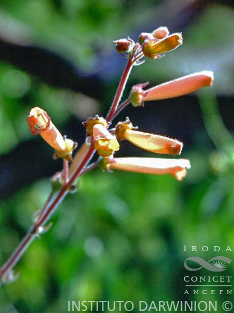 Hierbas perennes, con tubérculos de 3-8 cm de diámetro, subterráneos o rupícolas. Tallos erguidos, de 30-120 cm de alto × 3-8 mm de diámetro en la base, verdes a rojizos, con pubescencia de variada densidad, ramificaciones secundarias presentes. Hojas opuestas o ternadas; pecíolos de 0,1-0,6 cm de largo; láminas ovales o elípticas, de 3-10 × 1-3,5 cm sobre el tallo principal, de 2- 4,5 × 0,8-1,5 cm sobre las ramitas secundarias; agudas en el ápice, obtusas en la base, cara adaxial con pubescencia laxa, cara abaxial con pubescencia muy densa; margen crenulado con dientes de 1-2 × 1-4 mm; 6-7 pares de nervios secundarios, finos. Inflorescencias cimosas 1-3-floras, dispuestas en la axila de una bráctea de 5-10 mm de largo, de manera opuesta o ternada, escalonándose sobre un eje de 10-40 cm en la cima del tallo; pedúnculo ausente. Flores con pedicelo ascendente de 5-20 mm de largo, rojizo, cubierto, pubescente, arqueado en la parte apical; cáliz subcampanulado de lóbulos subiguales, lanceolados, acuminados en el ápice, de 10 × 4-5 mm, verdes a rojizos, con un indumento muy denso en la base, esparcido en el ápice; corola tubular de 30-50 mm de largo, muy frecuentemente hinchada dorsalmente en la base, después estrechándose bruscamente a 5 mm de diámetro, ensanchándose hasta 6-7 mm, de color rosa pálido a rojizo, glabrescente en la base, con pubescencia laxa sobre el resto del tubo y algunos tricomas cerca del limbo; lóbulos subiguales, semiorbiculares, ca. 4 × 5-6 mm, los 2 horizontales por encima de las anteras, los otros 3 patentes; estambres con filamentos de 28-45 mm de largo, de color rosa, glabrescentes; anteras conniventes, inclusas a ligeramente exertas, polen de color crema; nectario formado de 5 glándulas, 2 dorsales desarrolladas y connadas en la base, 3 reducidas, situadas en posición lateral y ventral; ovario cónico, blanco-verduzco, tomentoso; estilo de 30-50 mm de largo, glabrescente, de color rosa a rojizo; estigma incluso o a veces exerto. Fruto una cápsula seca, cónica, de 1-1,5 × 0,8 cm, apiculada. Semillas elipsoides, ca. 1 mm de largo, estriadas.