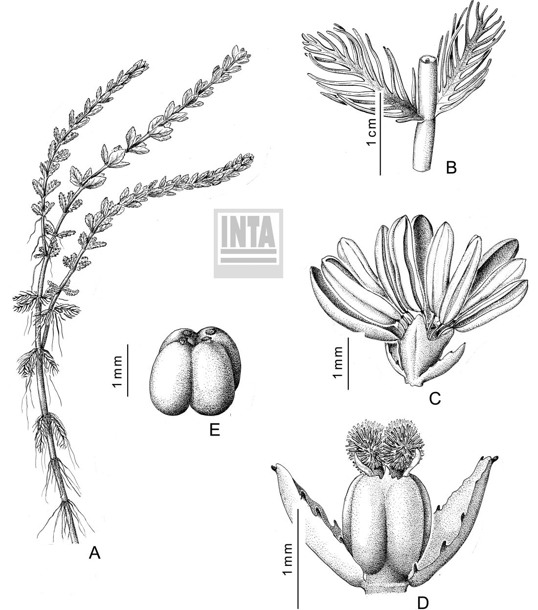 Hierbas acuáticas, perennes, polígamas; tallos hasta de 3 m de largo con 2-8 emergencias estrobiliformes en cada nudo. Hojas verticiladas, 4(-5) por nudo, dimorficas, las sumergidas anchamente ovadas y laciniadas, de 1,7-3,7 cm de largo, con emergencias en la base y el ápice de cada lacinia; las aéreas enteras, elípticas a ovadas, de 0,5-1 cm de largo. Inflorescencias en espigas con flores en su mayoría perfectas; las pistiladas restringidas a la base, o bien constituidas sólo por flores pistiladas. Flores sésiles a subsésiles, circundadas por 2 brácteas ovadas, de margen entero a sinuado, provisto de emergencias glandulares . Flores estaminadas con sépalos de 0,8-1 mm de largo, connados en la porción inferior, a veces fi namente dentados; pétalos elípticos a ovados, de 2-2,5 mm de largo, generalmente caducos; estambres 8, anteras lineares de 1,7-2 mm de largo. Flores pistiladas con sépalos y pétalos rudimentarios, obtusos.