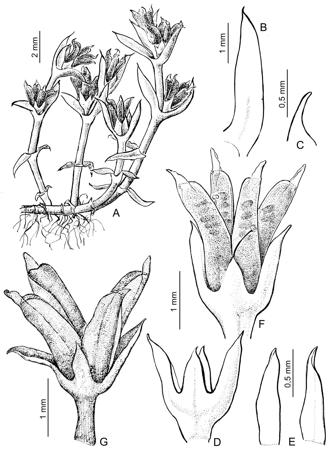Hierba de 1,5-4 cm de alto, anual; tallos floríferos erguidos, rastreros y radicantes en los nudos basales. Hojas con láminas angostamente triangulares, de 1,6-3,5 × 0,3-0,6 mm, caudiculadas. Flores subsésiles, 4-meras; pedúnculos de 0,7-0,8 mm de largo; sépalos triangulares, de 1,4-2 mm de largo, subiguales o los dos externos ligeramente mayores, agudos a apiculados; pétalos estrechamente ovados a lanceolados, de 2-2,5 × 0,5-0,8 mm, agudos o acuminados; estambres de 1-2 mm de largo, anteras redondeadas con los filamentos capilares; escamas nectaríferas fi liformes, de 0,6-1 mm de largo, hialinas. Frutos folículos subcilindroides, de 1,8-2,3 × 0,5-0,6 mm, de ápice obtuso. Semillas 9-22 por folículo, elipsoides, de 0,2-0,4 mm de largo, rugosas, castaño-oscuras.