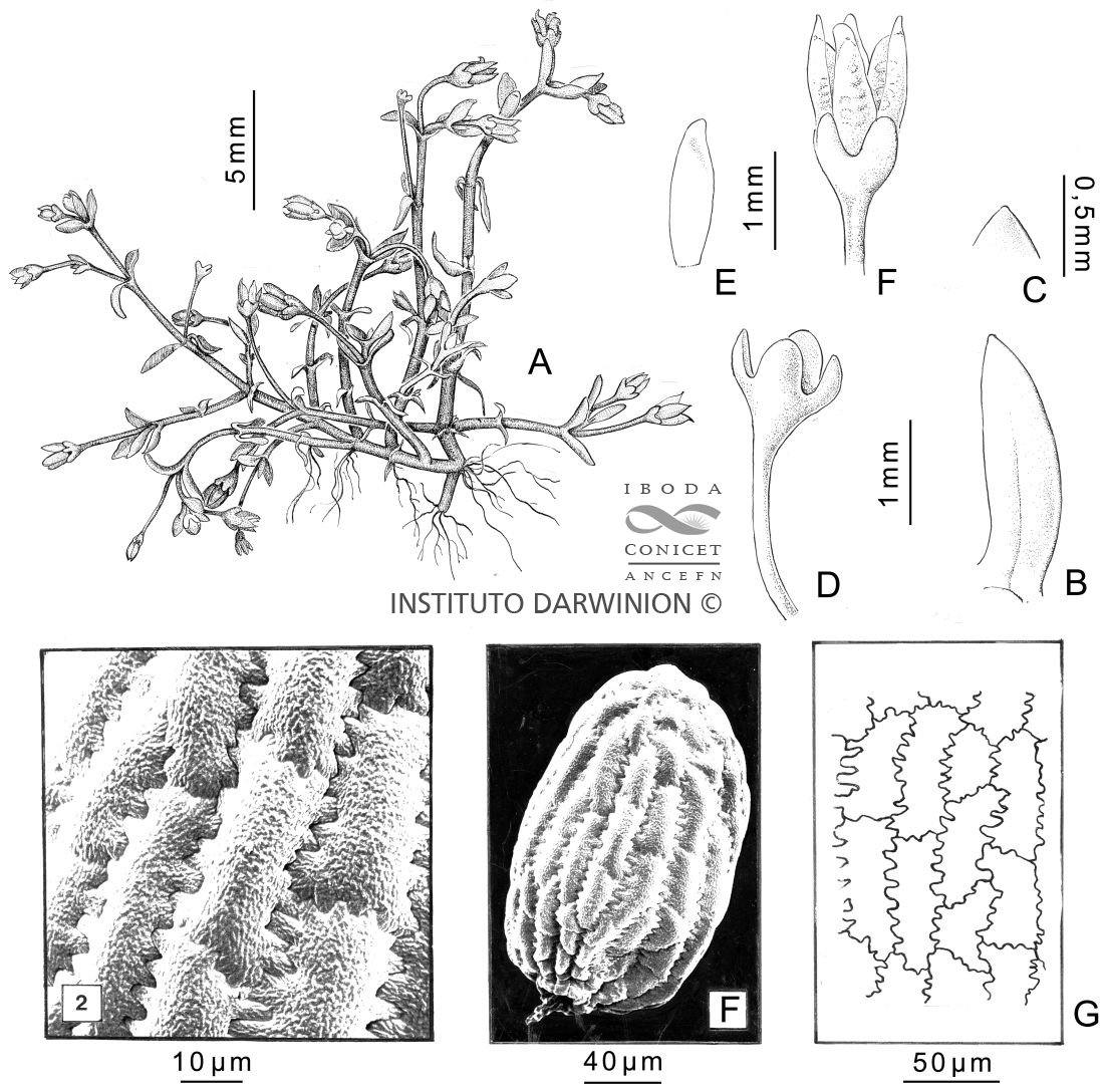 Hierba anual, pigmea, carnosa; tallos rastreros, radicantes. Hojas con láminas angostamente elípticas, de 1-3 mm de largo, subteretes, de ápice obtuso o agudo, connadas en la base. Flores 4-meras, solitarias, pseudoaxilares; subsésiles o con pedicelos de 1,5-6(-8) mm de largo; sépalos de 0,5-0,8 mm de largo, subiguales, obtusos; pétalos angostamente elípticos, de 1-1,7 mm de largo, ápice redondeado; estambres de 0,8 mm de largo; escamas nectaríferas de 0,4 mm de largo; carpelos apenas connados en la base, de 1-1,3 mm de largo. Semillas 12-17, de 0,25-0,28(-3) mm de largo, rugosas, opacas.