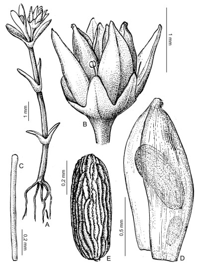 Hierba anual, pigmea, erecta; raíces fi brosas; tallos hasta de 10-15 mm de largo. Hojas con láminas linear-lanceoladas, de 1,5-3,5 × 0,3-0,5 mm, agudas, carnosas; pedicelos ca. 0,2 mm de largo. Flores 4-meras, axilares, subsésiles, 1 por nudo; sépalos subtriangulares de 0,5-0,7 × 0,3-0,5 mm, ápice redondeado; pétalos elípticos ca. 1,5 × 0,5 mm; estambres de 0,7-0,8 mm de largo; escama nectarífera filiforme, de 0,6-0,8 mm de largo. Frutos folículos elipsoides, de 1,3-2 × ca. 0,5 mm, a veces agudos hacia el ápice. Semillas 1-2, elipsoides, ca. 0,6 mm de largo, rugosas.