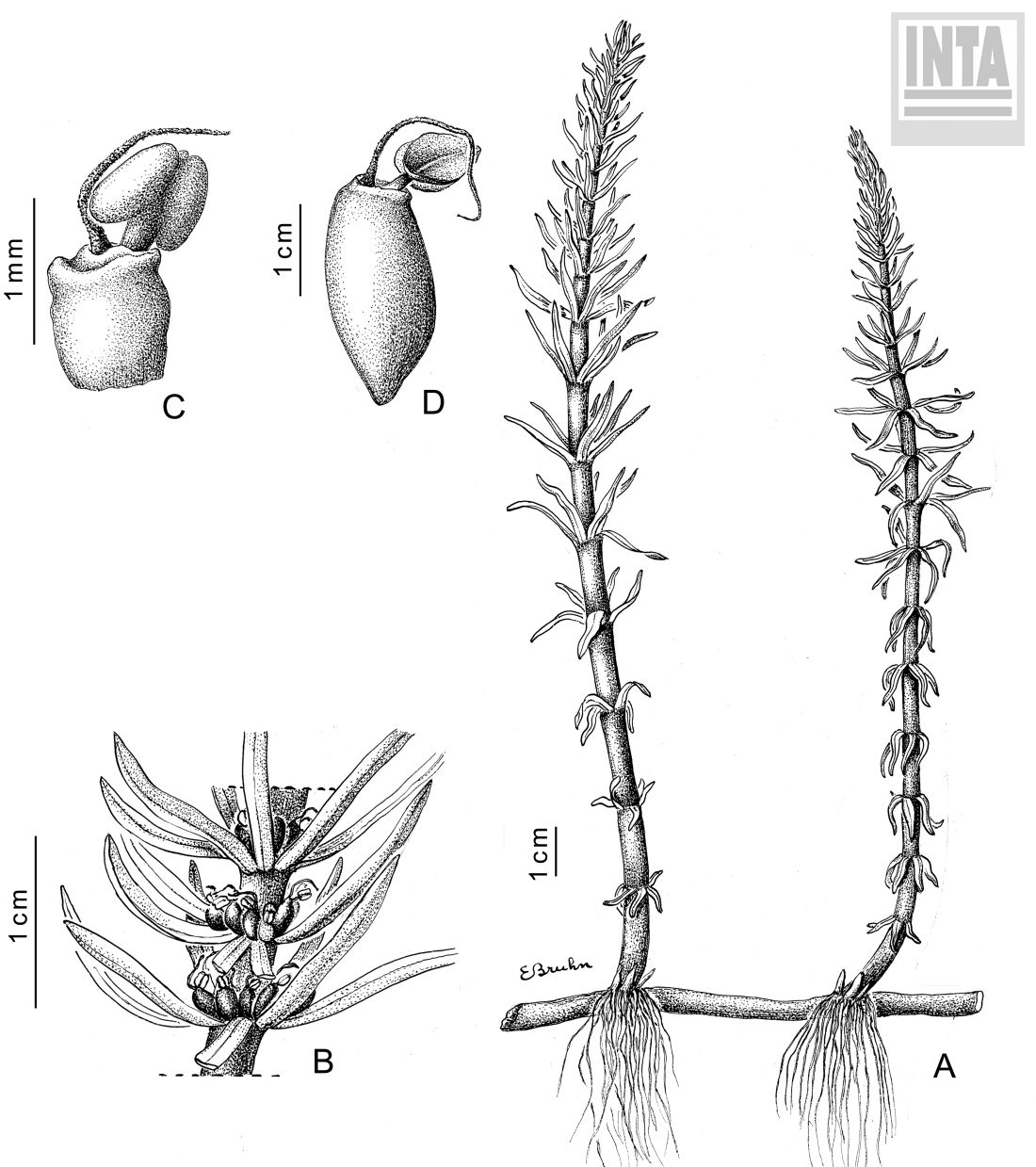 Observaciones: Nombres vulgares y usos. «Equiseto de agua», «pino de agua», «Mare’s tail» (Estados Unidos deAmérica). En medicina popular se la emplea como cicratizante y para el tratamiento de úlceras estomacales.