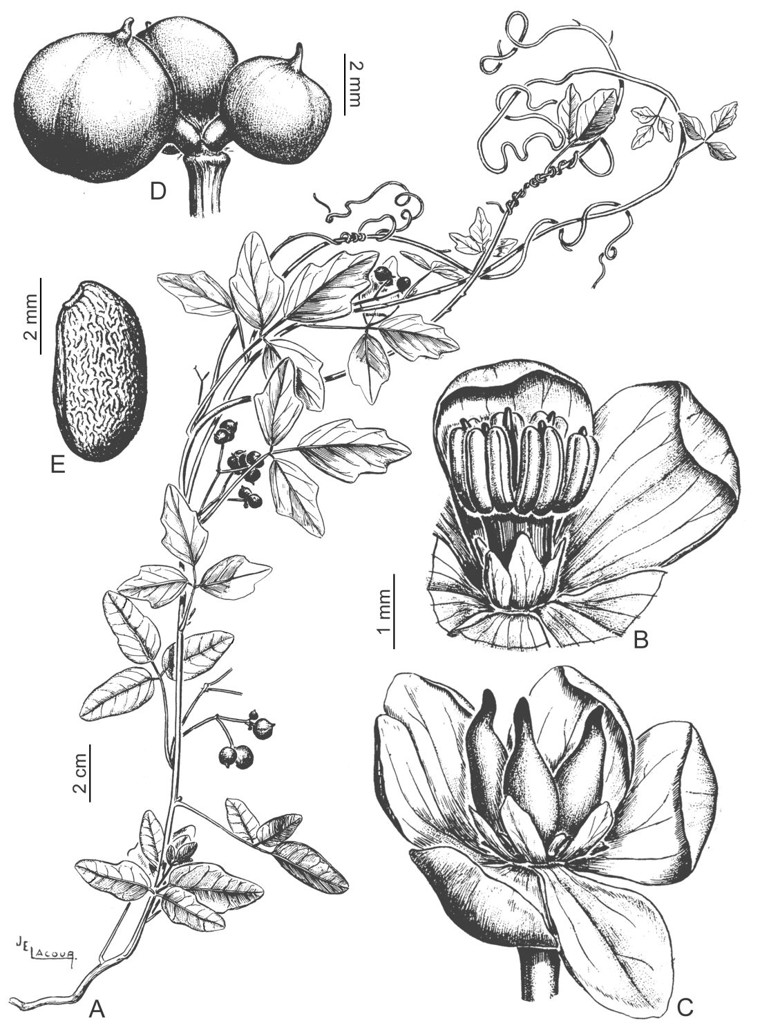 Lianas que pueden alcanzar la copa de los árboles. Hojas con pecíolos de 0,5-5,5 cm de largo; peciólulo medio más largo que los laterales. Infl orescencia con bractéolas de 1,5-2 mm de largo; pedicelos de 5-11 mm de largo. Flores estaminadas con sépalos externos de 4,5-6,5 × 2,5-4,5 mm, los internos de 3,5-6 × 2-3,5 mm; pétalos de 1-2,2 × 0,5-1 mm; columna estaminal de 1-3 mm de largo; anteras de 1-2 mm de largo. Flores pistiladas con sépalos externos de 3,9-4 × 2,4-2,6 mm, los internos de 3-3,5 × 2-2,3 mm; pétalos ca. 1,5 × 0,5 mm; ovario obclaviforme, ca. 2,5 × 0,5 mm. Fruto de 4,3-6,5 mm de diámetro. Semillas de 3,5-4,5 × 2-3 mm.