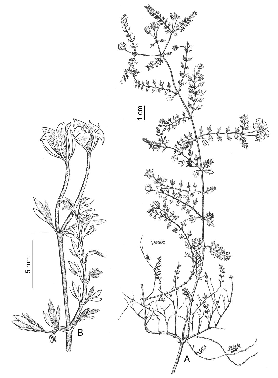 Subarbustos de 0,30-1 m de alto, pubescentes, a veces glabrescentes. Hojas opuestas con pecíolos de 1-2 mm de largo; láminas 3-sectas de contorno obovado, de 3-10 × 3-5 mm (raramente enteras o 2-sectas de contorno ovado) con el segmento medio entero, raramente 3-lobulado, margen liso, cara adaxial y abaxial pubescentes con tricomas simples y glandulares breves, ciliadas. Flores solitarias, axilares, a veces en cimas 3-fl oras; pedúnculos de 4-15 mm de largo; brácteas del calículo 3-sectas, cada segmento angostamente elíptico, de 4-5 × 1 mm, ciliado; sépalos ovados, de 5-6 × 2-2,5 mm, pubescentes, ciliados; pétalos obovados hasta obtriangulares, de 8-9 × 5-6 mm, obtusos, pubescentes y con una mayor densidad de tricomas hacia la base, amarillos; ovario globoso, de 1-1,5 mm de diámetro, 3-carpelar, viloso; ramas estigmáticas 3, lingüiformes, más largas que el ovario. Fruto una cápsula elipsoide, ca. 3 × 2 mm, distalmente hirsuta, con los sépalos persistentes y desarrollados. Semilla 1, de casi las mismas dimensiones que el fruto, lisa o con algunas verrucosidades en su superficie, castaño-oscura.