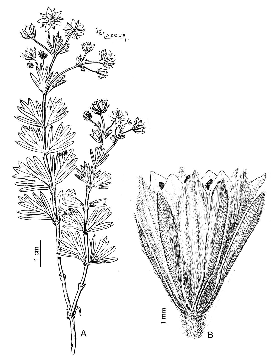 Subarbustos de 20-70 cm de alto, con escasos tricomas adpresos a glabrescentes. Hojas opuestas con pecíolo de 1-2 mm de largo; láminas 3-sectas, de contorno romboidal, de 12-17 × 10-11 mm, segmentos lanceolados, el central 3-5(-7)-fido, segmentos oblongos u oblanceolados, los laterales enteros o 2-3-fidos, laxamente seríceo-adpresos a glabrescentes. Flores en dicasios terminales y axilares; pedúnculos de 2-4 mm de largo; brácteas del calículo 3-sectas, segmentos angostamente elípticos, de 4-6 mm de largo, seríceos; sépalos elípticos a obovados, de 3-6 × 1-2,5 mm, acuminados, seríceos; pétalos elípticos a obovados, de 4-6 × 1,5-2,5 mm, amarillos; ovario subgloboso, de 1 mm de diámetro, 3-carpelar, hirsuto; ramas estigmáticas 3, lingüiformes, ca. 1,7 mm de largo, rojizas, con tricomas hirsutos en el dorso.