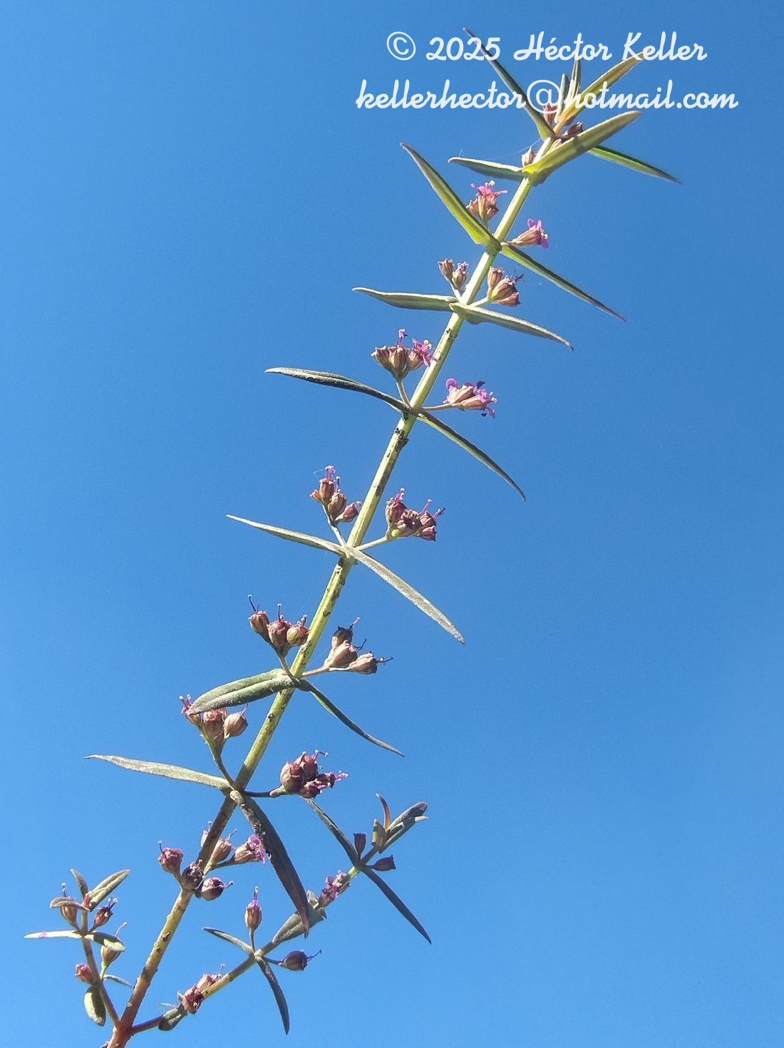 Hierba de 50-80 cm de alto, glabra. Hojas con láminas subuladas, de 4-7 × 0,4-1 cm, base auriculada. Inflorescencias en cimas paucifloras, axilares; pedúnculos de 6-8 mm de largo. Flores con pedicelos de 0,5-1 mm de largo, 2-bracteolados; tubo floral persistente, cupuliforme; sépalos 4; apéndices intersepalinos 4; pétalos 4, suborbiculares, de 2,5 mm de diámetro, fijos cerca del margen interno del tubo floral, rosados; estambres 4, fijos en la mitad inferior del hipanto; ovario globoso, de 1,2 mm de largo, estilo filiforme, ca. 2 mm de largo, exerto en la antesis, estigma capitado. Fruto una cápsula globosa, ca. 2,5 mm de diámetro, rodeada por el tubo floral hipertrofiado. Semillas de contorno subtriangular, ca. 0,4 mm de largo, dorso convexo y cara ventral excavada.