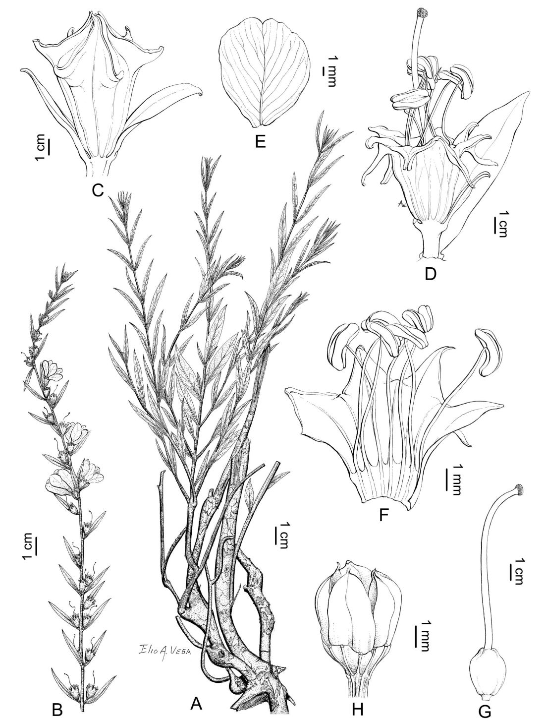 A. Ramas basales. B. Rama florífera. C. Botón floral. D. Flor. E. Pétalo. F. Flor desplegada. G. Gineceo. H. Fruto.