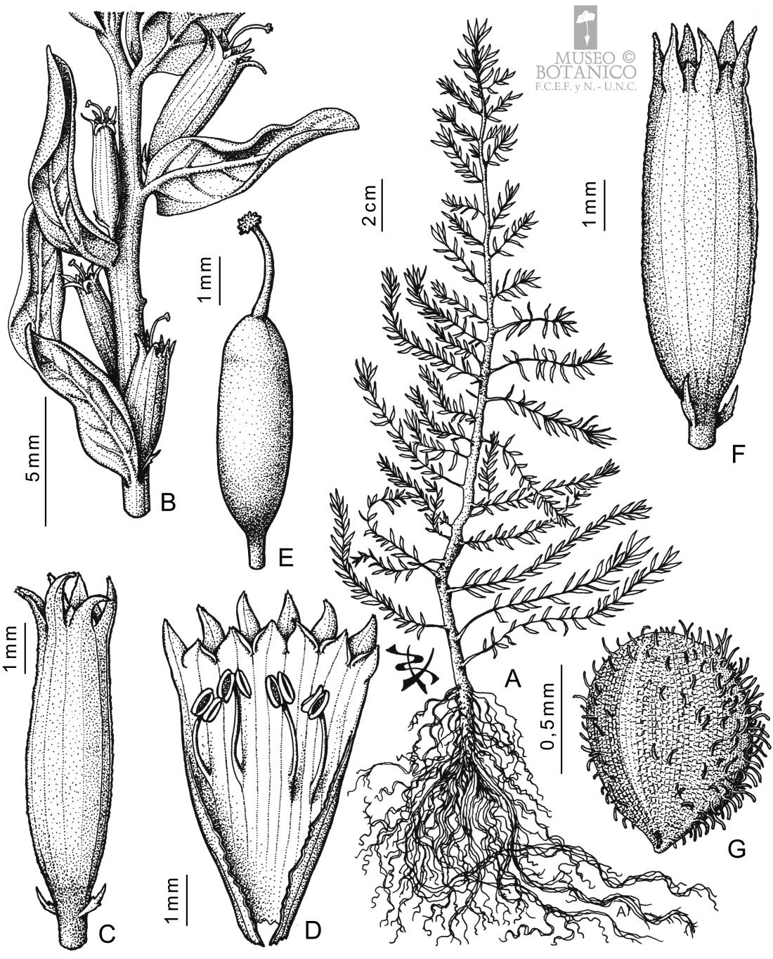 A. Habito. B. Rama floral. C. Flor abierta. D. Flor desplegada. E. Gineceo. F. Fruto. G. Semilla (de Stuckert 3833, CORD).