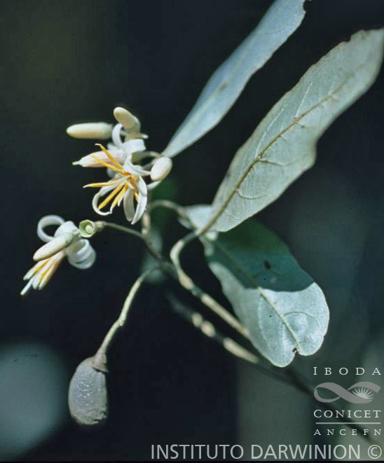 Árbol de 5-25 m de alto, las ramas jóvenes cubiertas densamente por escamas peltadas, plateadas, glabrescentes a la madurez. Hojas elíptico-lanceoladas, oblongas a obovadas, raro oblanceoladas, de 3-9 × 1,5-3,5 cm, cartáceas, discoloras, de base cuneada, ápice agudo a acuminado, cara adaxial glabra con puntos blancos, cara abaxial densamente cubierta por tricomas escamosos de 0,3-0,5 mm de diámetro, plateados y con la porción central de las escamas de color castaño; pecíolo de 6-10 mm de largo. Inflorescencia en racimos axilares de 3-6 cm de largo, hasta con 10 flores, raquis pubescente, cubierto por tricomas escamosos. Flores de 1-1,8 cm de largo, pedúnculo de 5-7 mm de largo; cáliz de 2-3,5 × 3-4 mm, cortamente 5-denticulado a inconspicuo, cubierto con tricomas escamosos, plateados, densos; corola con el tubo de 2-4 mm de largo, lóbulos lanceolados, reflejos, de 10-12 × 1-2 mm, densamente cubiertos de tricomas escamosos plateados en el exterior, en el interior a veces glabrescentes; estambres de 8-9 mm de largo, con los filamentos cubiertos en la cara ventral de tricomas barbados, en la cara dorsal con tricomas escamosos y estrellados; anteras de 5-6 mm de largo, con tricomas estrellados dispersos sobre las tecas; ovario de 2-2,5 × 1-2 mm, con indumento denso de tricomas escamosos, plateados, estilo filiforme, glabro. Fruto una drupa elipsoide u obovoide de 1-1,2 × 0,4-0,6 cm, recubierta por tricomas escamosos plateados semejantes a puntuaciones y con el cáliz persistente.