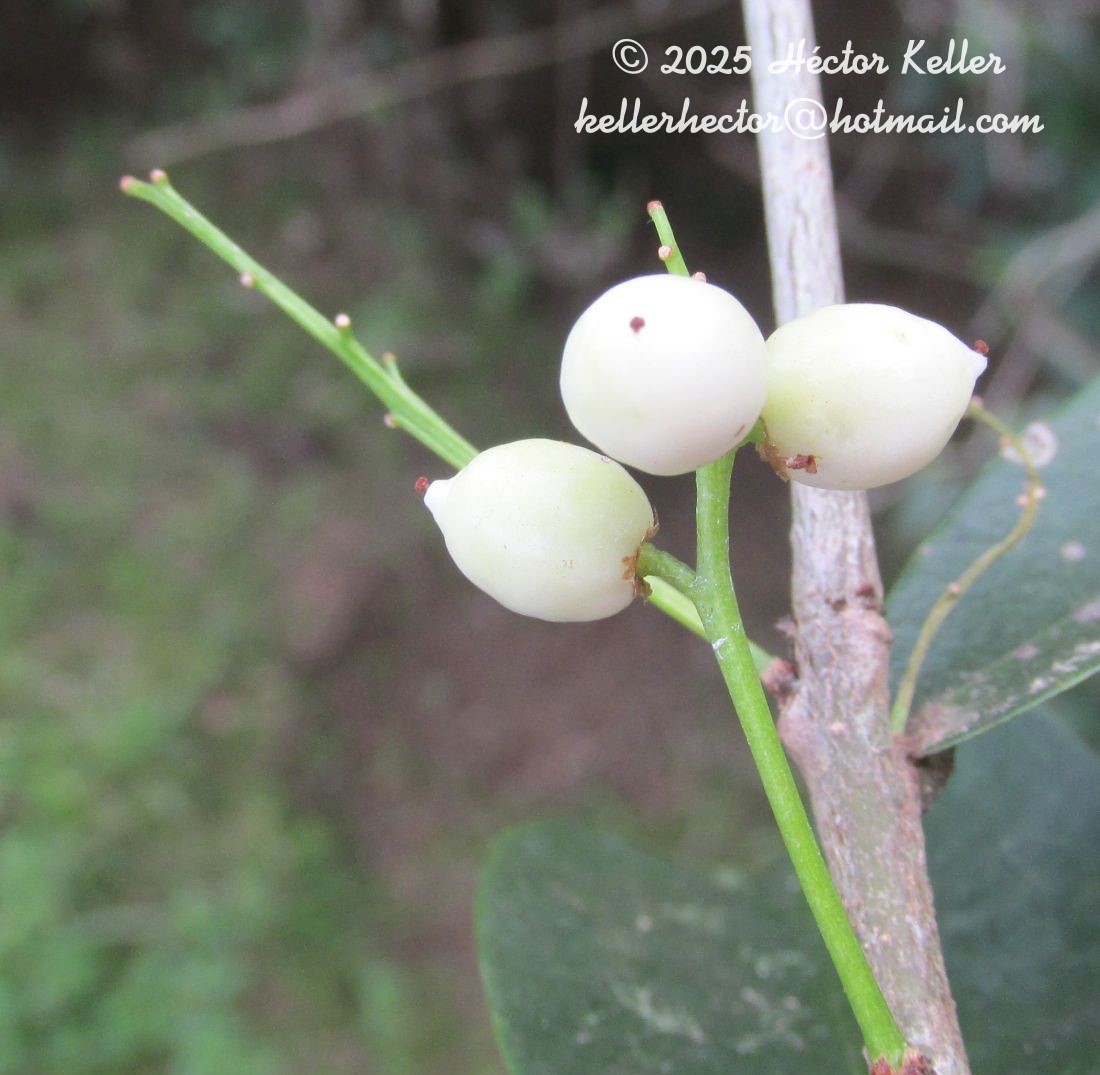 Arbusto o arbolito de 1-3 m de alto; corteza fibrosa. Hojas con pecíolo de 1-3 mm de largo; lámina espatulado-lanceolada u obovada, de 5-16 × 2-6,5 cm, base generalmente subauriculada, a veces obtusa, ápice obtuso o agudo, raramente emarginado, coriácea, glabra. Inflorescencias en racimos axilares, 1-2(-8) por nudo foliar, de 2-5,5 cm de largo, 4-15 floras; pedúnculos con catáfilos escariosos de margen pubescente en la base; flores articuladas sobre los ejes laterales de la inflorescencia ebracteadas. Inflorescencia estaminada 5-15-flora; flores blanco-amarillentas; tubo infundibuliforme, de 4-6,5 mm de largo, pubescente interiormente; lóbulos anchamente ovados y levemente pubescentes sobre el dorso, en el ápice y ciliados; pétalos ausentes o reducidos a un anillo inconspicuo; estambres 8, exertos, subsésiles, anteras de 0,5 mm de largo; pistilodio de 4 mm de largo, rodeado por un disco tubuloso de borde irregularmente lobulado de color anaranjado, estilo filiforme. Inflorescencia pistilada 4-7-flora; flores blanco-verdosas; tubo urceolado, de 2,5-5 mm de largo, con pubescencia similar a las de las flores estaminadas; pétalos ausentes o reducidos a un anillo inconspicuo; estaminodios ausentes o inconspicuos; gineceo rodeado por un disco cupuliforme de borde irregular de color anaranjado, estilo grueso, estigma capitado, papiloso. Fruto una baya ovoide o subglobosa, de 7-9 mm de largo, apiculada, blanco-perlada.