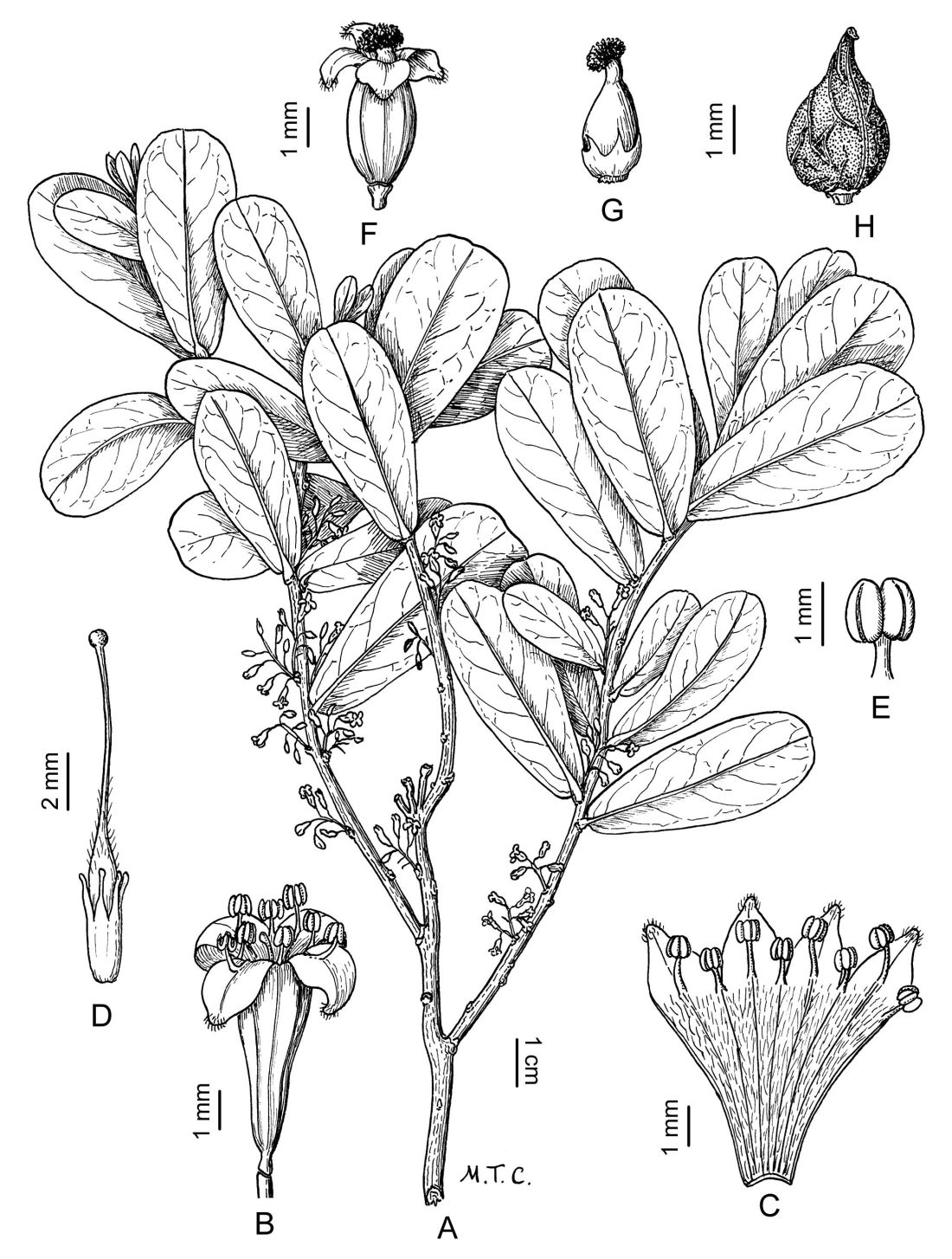 Arbusto o arbolito de 1-3 m de alto; corteza fibrosa. Hojas con pecíolo de 1-3 mm de largo; lámina espatulado-lanceolada u obovada, de 5-16 × 2-6,5 cm, base generalmente subauriculada, a veces obtusa, ápice obtuso o agudo, raramente emarginado, coriácea, glabra. Inflorescencias en racimos axilares, 1-2(-8) por nudo foliar, de 2-5,5 cm de largo, 4-15 floras; pedúnculos con catáfilos escariosos de margen pubescente en la base; flores articuladas sobre los ejes laterales de la inflorescencia ebracteadas. Inflorescencia estaminada 5-15-flora; flores blanco-amarillentas; tubo infundibuliforme, de 4-6,5 mm de largo, pubescente interiormente; lóbulos anchamente ovados y levemente pubescentes sobre el dorso, en el ápice y ciliados; pétalos ausentes o reducidos a un anillo inconspicuo; estambres 8, exertos, subsésiles, anteras de 0,5 mm de largo; pistilodio de 4 mm de largo, rodeado por un disco tubuloso de borde irregularmente lobulado de color anaranjado, estilo filiforme. Inflorescencia pistilada 4-7-flora; flores blanco-verdosas; tubo urceolado, de 2,5-5 mm de largo, con pubescencia similar a las de las flores estaminadas; pétalos ausentes o reducidos a un anillo inconspicuo; estaminodios ausentes o inconspicuos; gineceo rodeado por un disco cupuliforme de borde irregular de color anaranjado, estilo grueso, estigma capitado, papiloso. Fruto una baya ovoide o subglobosa, de 7-9 mm de largo, apiculada, blanco-perlada.