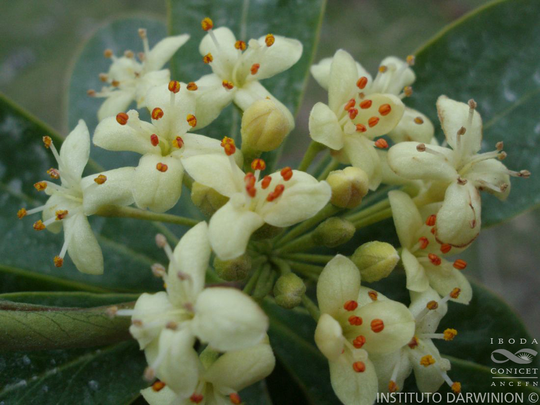 Arbustos de 0,80-2,50(-4) m de alto; corteza castaño-rojiza a pardo-grisácea, glabra a densamente pilosa. Hojas con pecíolos breves, algo abultados, glabros a pilosos; lámina lanceolada o, a veces, levemente espatulada, de 4-8 × 1,5-2 cm, base cuneada, ápice agudo u obtuso; cara adaxial verde, algo brillante, glabra; cara abaxial verde-blanquecina, glabra a escasamente serícea. Inflorescencias 8-20-floras; pedúnculos de 6-21 mm de largo. Flores blancas, fragantes. Flores perfectas y estaminadas con pedicelo de 4-8 mm de largo; tubo ca. 3 × 1,5-2 mm, lóbulos ca. 3,5 × 2,5 mm; filamentos de los estambres opositisépalos de 1,5- 2 mm de largo, los de los alternisépalos de 2,5-3 mm de largo; anteras ca. 0,5 × 0,3 mm; disco en forma de anillo papiliforme; estilo de 3-4 mm de largo. Flores pistiladas con pedicelo de 5-8 mm de largo; tubo ca. 2,5 × 1,5 mm, lóbulos ca. 2 × 2 mm; estilo de 1,5-2 mm de largo. Fruto piriforme, de 7-10 × 5-7 mm, pericarpo ca. 1 mm de espesor, blanco-perlado.
