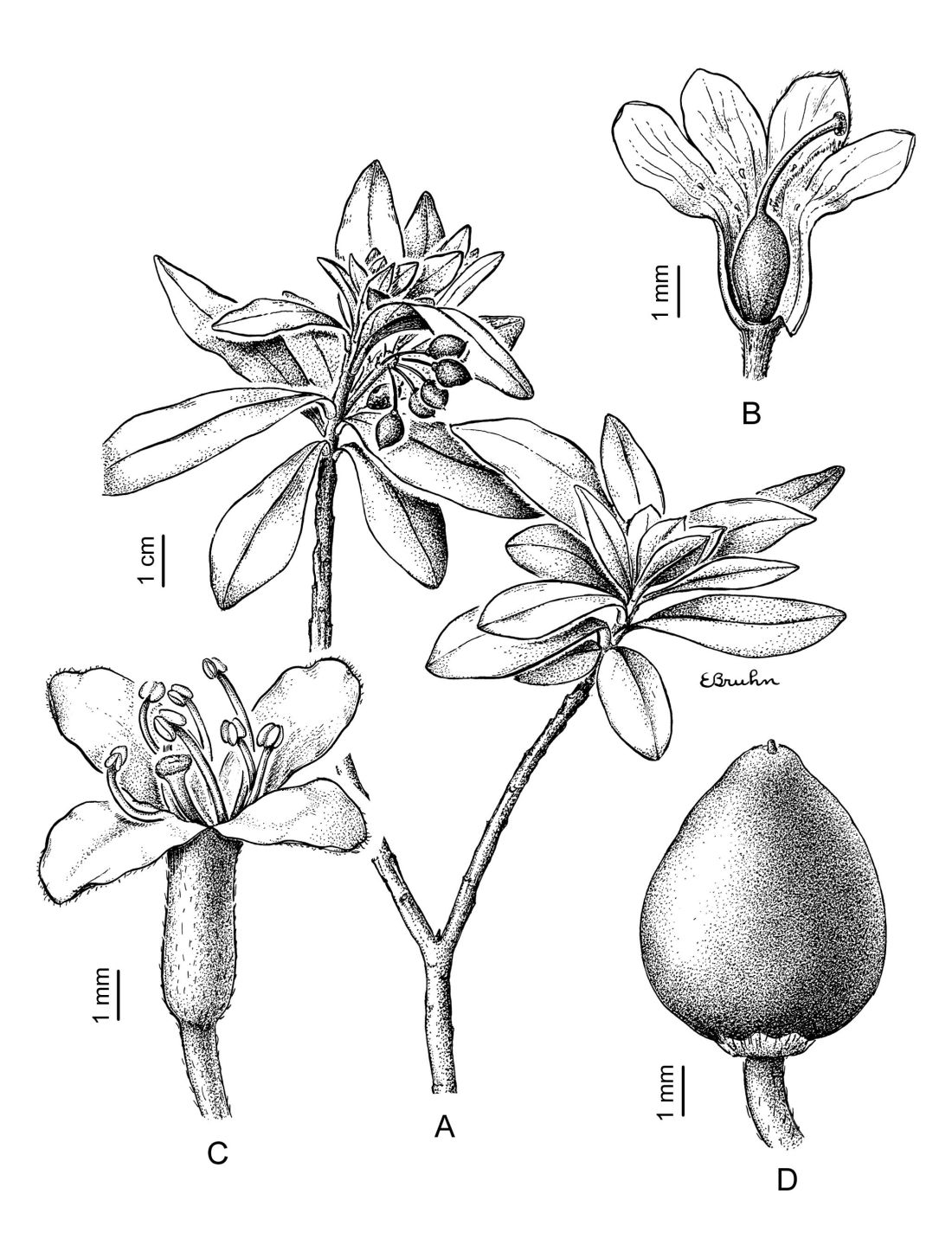 Arbustos de 0,80-2,50(-4) m de alto; corteza castaño-rojiza a pardo-grisácea, glabra a densamente pilosa. Hojas con pecíolos breves, algo abultados, glabros a pilosos; lámina lanceolada o, a veces, levemente espatulada, de 4-8 × 1,5-2 cm, base cuneada, ápice agudo u obtuso; cara adaxial verde, algo brillante, glabra; cara abaxial verde-blanquecina, glabra a escasamente serícea. Inflorescencias 8-20-floras; pedúnculos de 6-21 mm de largo. Flores blancas, fragantes. Flores perfectas y estaminadas con pedicelo de 4-8 mm de largo; tubo ca. 3 × 1,5-2 mm, lóbulos ca. 3,5 × 2,5 mm; filamentos de los estambres opositisépalos de 1,5- 2 mm de largo, los de los alternisépalos de 2,5-3 mm de largo; anteras ca. 0,5 × 0,3 mm; disco en forma de anillo papiliforme; estilo de 3-4 mm de largo. Flores pistiladas con pedicelo de 5-8 mm de largo; tubo ca. 2,5 × 1,5 mm, lóbulos ca. 2 × 2 mm; estilo de 1,5-2 mm de largo. Fruto piriforme, de 7-10 × 5-7 mm, pericarpo ca. 1 mm de espesor, blanco-perlado.