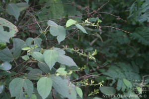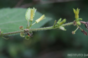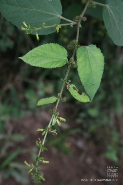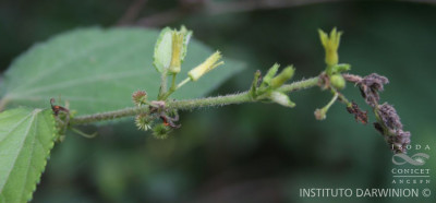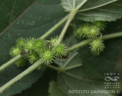 Subarbustos con tallos muy ramificados desde la base, ramas jóvenes pubescentes, de (40-) 60-120 (-250 ) cm alt. Hojas híspido-tomentosas con lámina elíptica a circular, las superiores enteras, las basales 2-3-lobadas, márgenes irregularmente aserrados, pecíolo cilíndrico, angosto, estípulas prontamente deciduas. Inflorescencias cimosas dicótomas con flores aglomeradas de a 2-sobre ramas cortas en los nudos superiores del tallo y la axila de los nomófilos, pedúnculos frágiles a la madurez del fruto. Flores perfectas de sépalos alargados, superiormente atenuados, glabros en el haz, pubescentes en el envés, de 4-7 mm long. Pétalos hialinos, amarillos, poco pubescentes en la porción basal de los márgenes, de 3-5 mm long. x 0,6-1,2 mm lat. Urcéolo hialino, glabro, de 0,1-0,2 mm alt., glándulas del gonóforo elípticas de 0,2 mm long. x 0,1 mm lat. Ovario cónico globoso de 0,5-1,2 mm long., recubierto por 50-90 papilas erectas, cónico curvadas, carnosas. Estambres 10-15, anteras pequeñas, reniformes, filamentos aplanados, hialinos, de 4-6 mm long. Frutos color marrón oscuro, cuerpo de 3-4 mm diám. y con espinas de 2-3 mm long., provistas de pelos retrorsos, muy lignificado, lóculos 2, con una semilla en cada uno, muchas veces desiguales, poligonal-redondeadas, episperma marrón rojizo, endosperma cartilaginoso, de 1-2 mm long