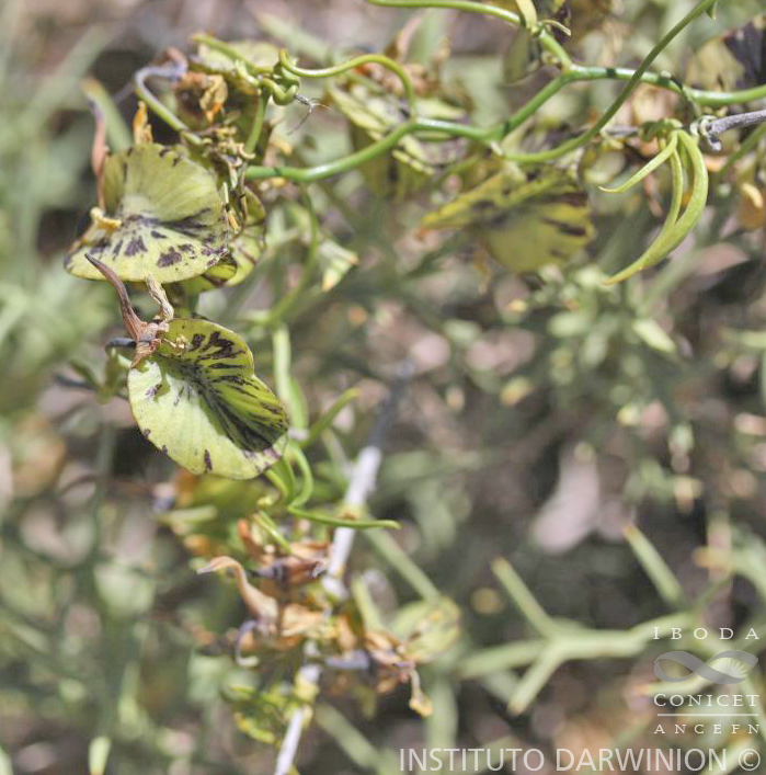 Hierbas perennes, trepadoras, glabras; tubérculos globosos, de 1-2 cm diámetro o elipsoides de 2-4 × 1-1,5 cm. Hojas peltadas (céntricas), palmaticompuestas o simples y palmatisectas; folíolos o lóbulos 3-4(-5), lineares, angostamente oblongos o angostamente elípticos, de 0,5-2,5 × 0,05-0,4 cm, enteros, inermes, sésiles; pecíolos de 0,7-4 cm de largo. Flores con pedicelos de 1,5-3,5 cm de largo; cáliz 5-lobado; lóbulos amarillo-verdosos, de 6-10 mm de largo, espolón amarilloverdoso a negruzco, conspicuo, infundibuliforme, de 10-15 mm de largo, curvado, ápice algo dilatado; pétalos amarillos con venas púrpuras, los superiores 2, de 7-14 × 2-5 mm, espatulados, emarginados, pétalos inferiores 3, de 5-12 × 2-4,5 mm, unguiculados, lámina ondulada y/o emarginada, sin lacinias, con 2 aurículas en la base, involutas, formando un bolsillo; estilo con una rama estigmática más desarrollada que las otras. Fruto sámara castaña, anchamente 3-alada.
