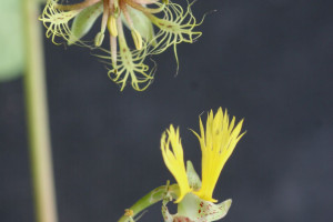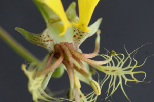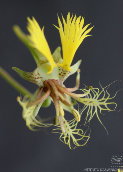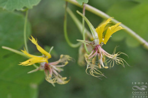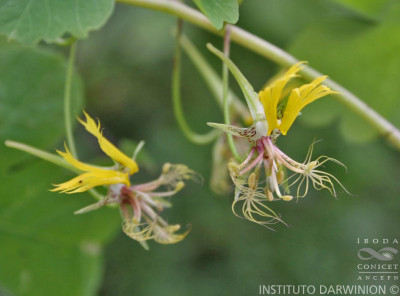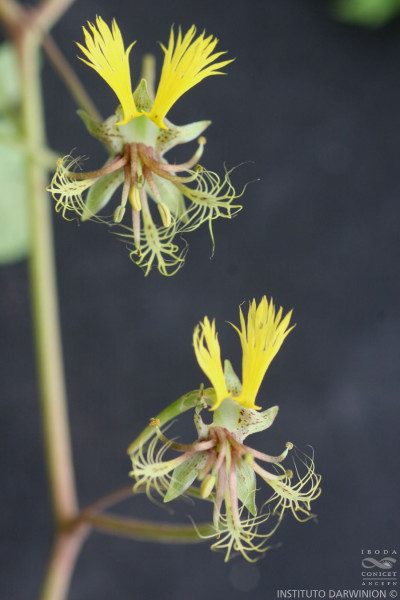 Hierbas perennes, trepadoras, glabras o apenas pubescentes en la base de los pecíolos; raíces fusiformes. Hojas peltadas (excéntricas), simples, palmatipartidas; láminas de contorno suborbicular, de 2-9 × 2,5-10 cm, lóbulos 5, obovados o elípticos, de 2-6,5 × 1-5 cm, los dos laterales enteros, los 3 centrales 3-lobulados a pinnatipartidos, mucronados; pecíolos de 2-12 cm de largo. Flores con pedicelos de 1,5-5 cm de largo; cáliz 5-lobado, lóbulos verdosos con máculas purpúreas, de 4-7 mm de largo, espolón verdoso, conspicuo, angostamente cónico, de 10-15 mm de largo, recto, ápice agudo, algo curvado; pétalos superiores 2, amarillos, de 8-12 × 5-10 mm, espatulados, 3-5 lobulado-ciliados en el ápice, auriculados en la base, lóbulos 2-fidos a 3-fidos, aurículas de menor longitud que los lóbulos, pétalos inferiores 3, amarillo-verdosos, de 6-9 × 0,5-1 mm (sin cilias), de tamaño semejante o algo menores a los superiores, unguiculados, de lámina reducida y finamente laciniada. Fruto esquizocarpo con 3 mericarpos desarrollados, sin alas (no visto, sensu Sparre & Andersson, 1991).