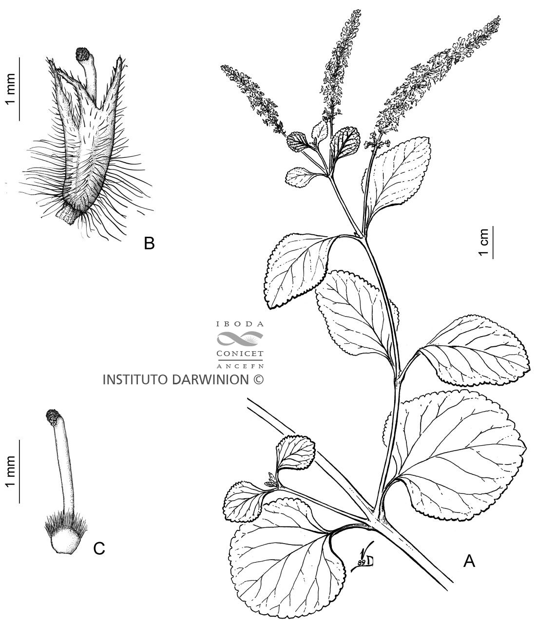 A. Rama florífera. B. Cáliz, vista lateral. C. Gineceo.