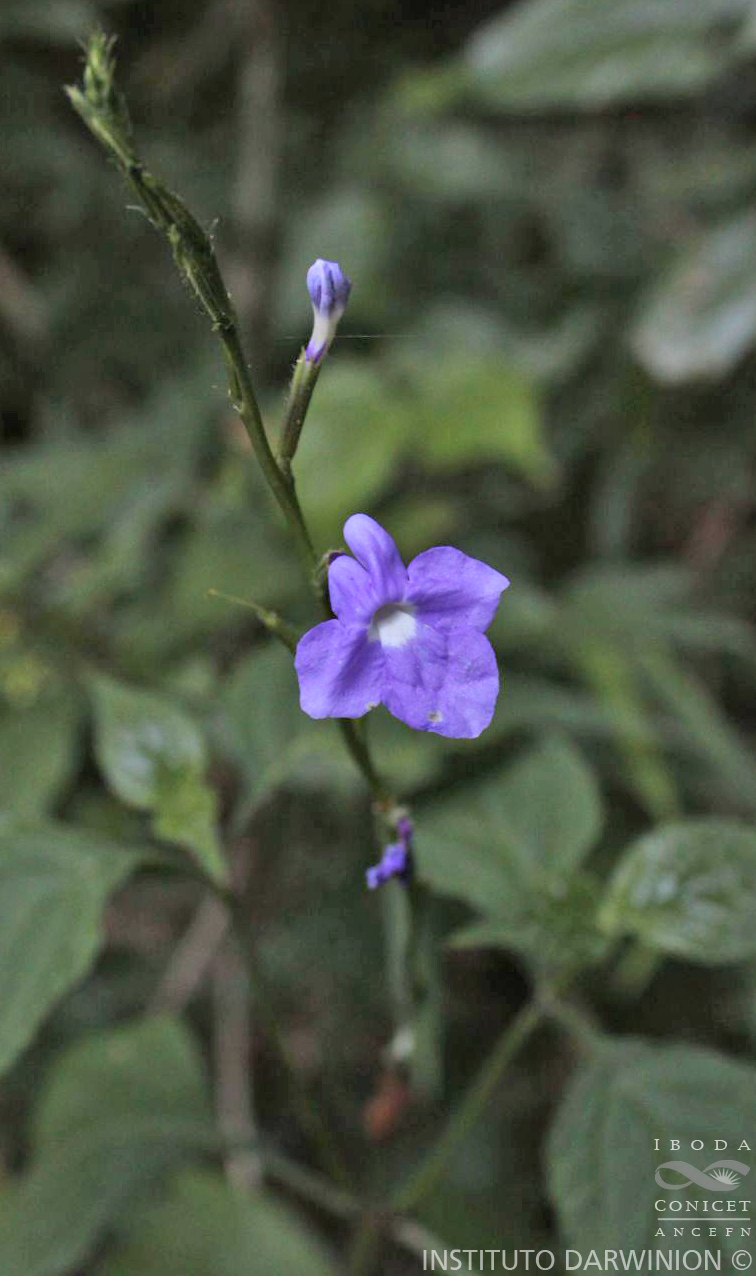 Sufrútices de 80-150 cm de alto. Hojas con pecíolo de 1-3 cm de largo; láminas de 5,5-11 x 3-5,5 cm, membranáceas, ovadas a elípticas, base decurrente, ápice agudo, margen aserrado, venas secundarias con tendencia a unirse formando arcos, tallos y hojas con pubescencia de pelos cortos y blancos, de densidad variable hasta casi glabros. Sinflorescencias de 14-17(-25) cm de largo, laxas, a veces más densas. Flores con pedúnculos de 2-4 cm de largo; brácteas de 4-5 mm de largo; bractéolas ca. 1 mm de largo; cáliz hispídulo, con dientes acuminados, los abaxiales de 1,5 mm de largo, el adaxial de 0,5 mm de largo; corola azul o lilacina, tubo de 1,7-1,9 mm de largo, curvado, limbo amplio; estambres con filamentos glabros, tecas paralelas, subiguales, con el conectivo superándolas; gineceo de 1,6-1,8 cm de largo. Fruto con estípite de 1-1,5 mm de largo, clusas de 1,2-1,6 cm de largo; rostro de ápice atenuado.