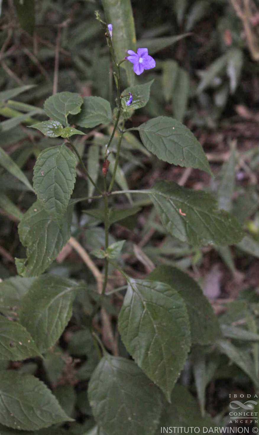 Sufrútices de 80-150 cm de alto. Hojas con pecíolo de 1-3 cm de largo; láminas de 5,5-11 x 3-5,5 cm, membranáceas, ovadas a elípticas, base decurrente, ápice agudo, margen aserrado, venas secundarias con tendencia a unirse formando arcos, tallos y hojas con pubescencia de pelos cortos y blancos, de densidad variable hasta casi glabros. Sinflorescencias de 14-17(-25) cm de largo, laxas, a veces más densas. Flores con pedúnculos de 2-4 cm de largo; brácteas de 4-5 mm de largo; bractéolas ca. 1 mm de largo; cáliz hispídulo, con dientes acuminados, los abaxiales de 1,5 mm de largo, el adaxial de 0,5 mm de largo; corola azul o lilacina, tubo de 1,7-1,9 mm de largo, curvado, limbo amplio; estambres con filamentos glabros, tecas paralelas, subiguales, con el conectivo superándolas; gineceo de 1,6-1,8 cm de largo. Fruto con estípite de 1-1,5 mm de largo, clusas de 1,2-1,6 cm de largo; rostro de ápice atenuado.