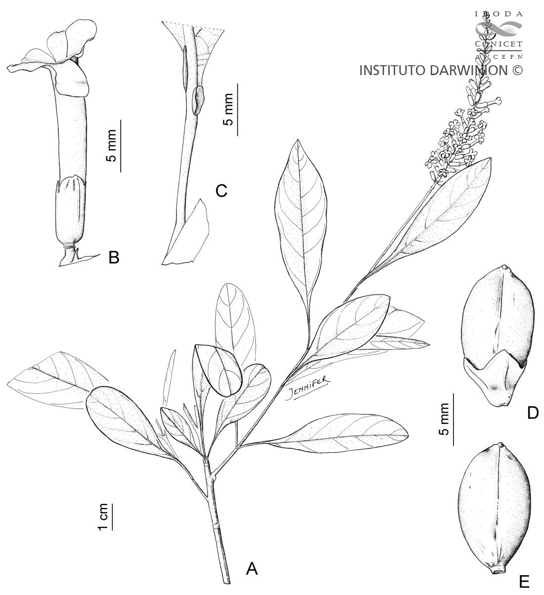 Árboles hasta de 12 m de alto; ramas de sección circular, entrenudos de 2-4 cm de largo, inermes. Hojas opuestas o verticiladas, pecíolos de 1,5-2 cm de largo, con o sin glándulas pateniformes en el ápice del pecíolo; láminas de 4-10 x 2,5-4 cm, elípticas, cartáceas, con ápice agudo o cuspidado, base atenuada, margen entero, cara abaxial pilosa sobre venas y barbado pilosas en las axilas de los nervios secundarios. Florescencias de 8-15 cm de largo, ca. 20-floras, ejes pilosos. Flores alternas, dispersas, pedicelos ca. 1 mm de largo; brácteas lineares, ca. 1,5 mm de largo; cáliz tubuloso en la flor, campanulado y persistente en el fruto, de 5 mm de largo, tubo de 4 mm de largo, punteado-glanduloso, 5-dentado en el margen, dientes triangulares de 1 mm de largo; corola amarillenta, perfumada, ca. 1,5 cm de largo, tubo recto, glabro, lóbulos desiguales, obtusos; estambres didínamos, conectivo menor que las tecas, filamentos glabros. Fruto ovoide, castaño claro a la madurez, de 1 cm de largo x 5 mm de diámetro.