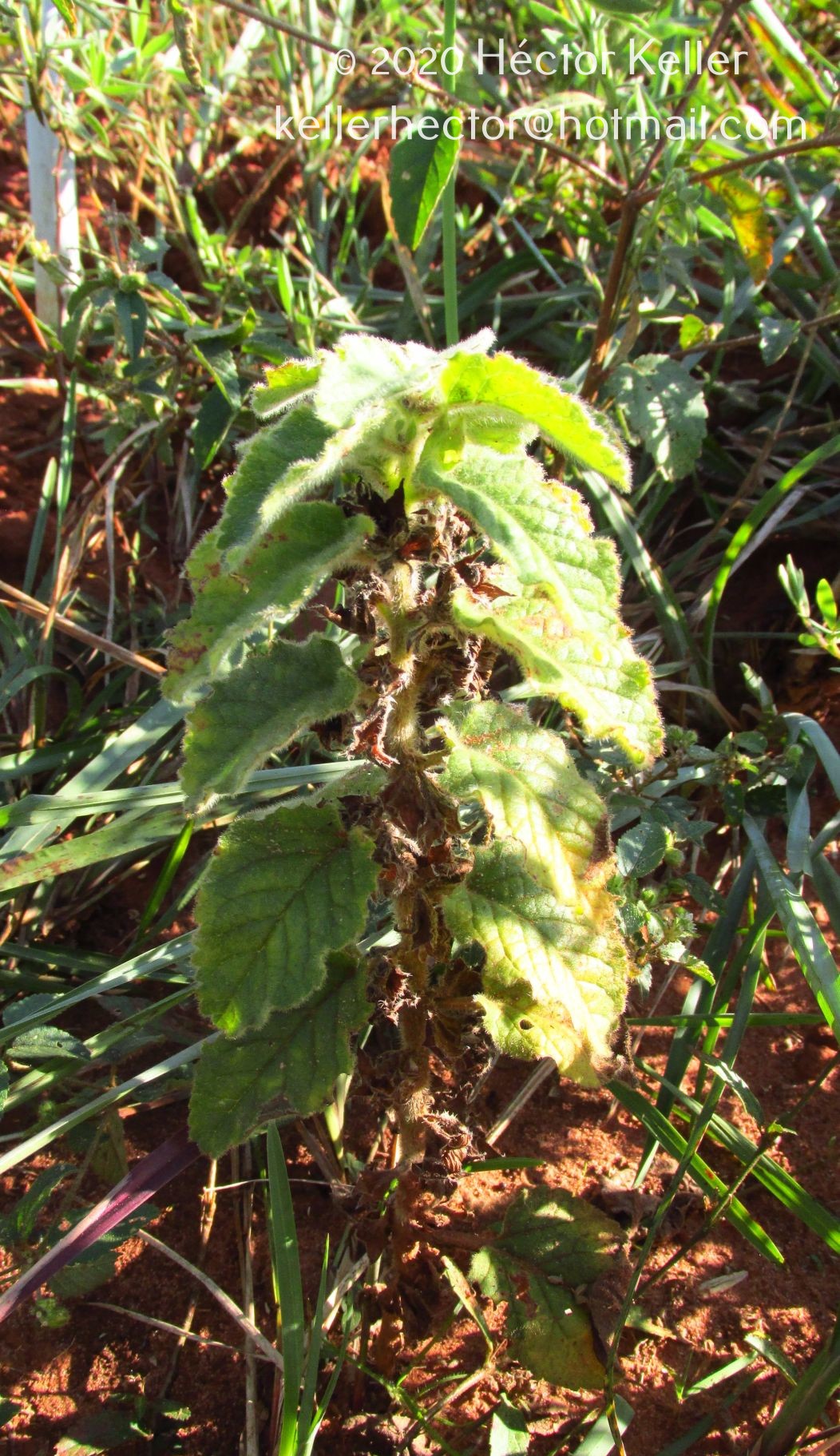 Sufrútices de 10-25 cm de alto; tallos densamente híspidos, con abundantes pelos retrorsos hasta de 2,5(-3) mm de largo, canescentes cuando jovenes. Hojas opuestas con peciolo de 0,5-2 cm de largo, lámina ovada, de 2-4,5 × 1,5-3 cm, base truncada, ápice redondeado, margen crenado- serrado, pubescencia serícea en ambas superficies. Flores dispuestas en cimas axilares paucifloras, de 2-4 flores; pedicelo de 0,5-1 cm de largo; bractéolas lineares, de 0,6-1,2 cm de largo, acuminadas, híspidas; cáliz campanulado, de 1,5-2 cm de largo, dientes 5, triangulares, anchamente agudos, de 6 mm de largo, pubescencia híspida con pelos ca. 2 mm de largo y abundantes pelos glandulares pedicelados; corola blanca, tubo largo y angosto, de 10 cm de largo, con abundante pubescencia glandular, lóbulos de 1,5-2 cm de largo; estilo y estambres exertos. Frutos ca. 1 cm de largo, con pubescencia híspida en la cara externa, dividido en 4 pirenas.