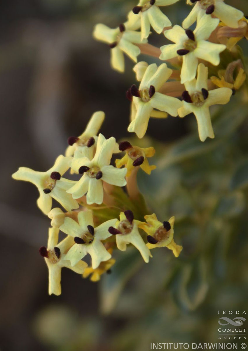 Sufrútices de 25-30 cm de alto, ramificados; ramas glabras, apoyantes, formando matas, ramas floríferas erectas, entrenudos de 7-10 mm de largo. Hojas con pecíolos de 5-7 mm de largo; láminas de 2-3,5 x 1-2 cm, angostamente ovadas, 3-lobadas, 3 ó 5- partidas a 2-pinnatipartidas, raro enteras, glabras, lóbulos ovados a filiformes, de 1,5-4,5-(5,5) mm de ancho, margen entero. Sinflorescencia en pleiobotrios heterotéticos, con paracladios bracteosos superando o no la florescencia principal, o en monobotrios, formadas por espigas multifloras, densas, raquis algo alargado en la fructificación, pedúnculo desarrollado, de 2- 7,5 cm de largo. Brácteas florales de (2-)3-4 mm de largo, ovadas, margen ciliado. Cáliz de 9-10,5 mm de largo, hispídulo, a veces sólo en la base, dientes de 1 mm de largo; corola de 14-20 mm de largo, color amarillo claro, superficie externa glabra, fauce pubescente; par superior de estambres con apéndices conectivales oscuros, claviformes, conspicuos, exertos de la garganta corolar; estilo de 16 mm de largo. Clusas de 4-5 mm de largo, subcilíndricas, ápice redondeado y base no angostada y con repliegue basal y transversal de la pared comisural, superficie externa castaño oscura, reticulada, la interna con escasas papilas o sin ellas.