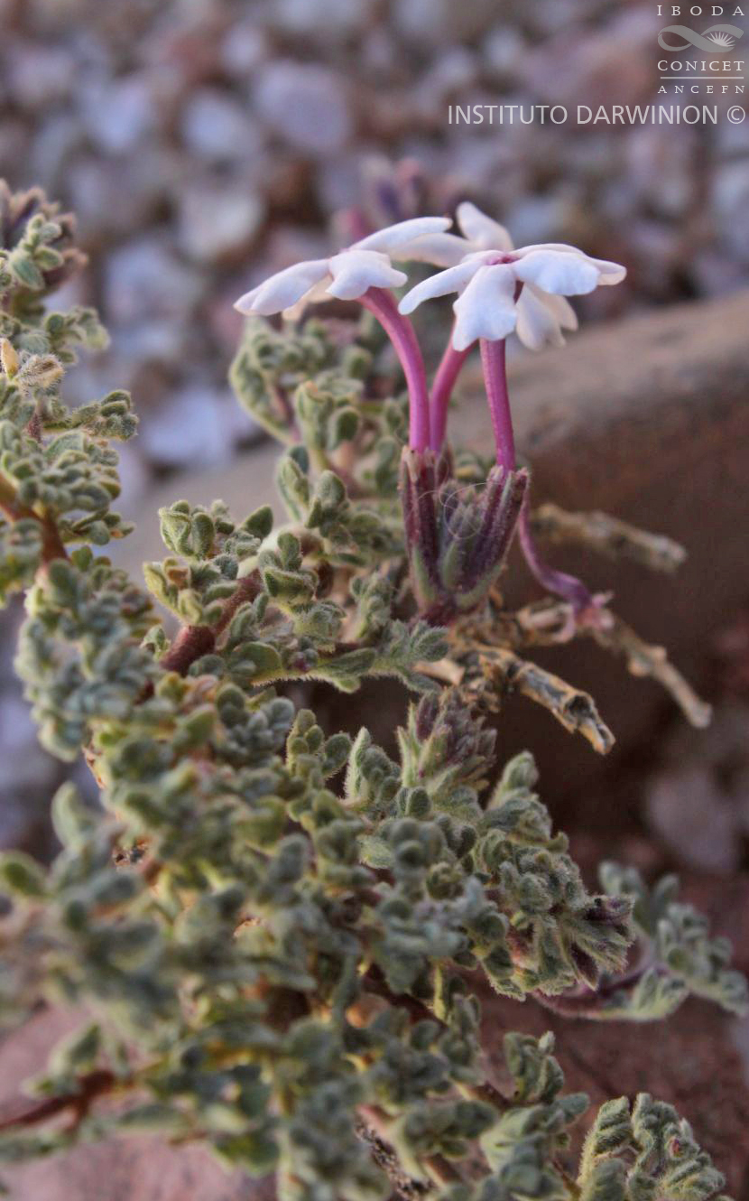 Sufrútices de 15-20 cm de alto, rastreros, rizomatosos, base leñosa, muy ramificados; ramas híspidas, las floríferas erectas; entrenudos de 1,5-2 cm de largo. Hojas con pecíolos de 2-4 mm de largo, láminas de 1,2-1,5 x 0,6-1 cm, oval-triangulares, 3-sectas, 2-pinnatipartidas, densamente híspidas en ambas caras, segmentos oblongos a elípticos, ápice obtuso, margen algo revoluto. Sinflorescencias en pleiobotrios con 1 ó más pares de paracladios a veces frondosos, ramificados o no, formadas por espigas densas multifloras, raquis algo alargado en la fructificación, pedúnculo de 1-2 cm de largo. Brácteas florales de 3-4,5 mm de largo, las apicales de 1,5-2 mm, angostamente ovadas, ápice agudo, híspidas, margen ciliado. Cáliz de 7-10 mm de largo, híspido a estrigoso hacia la base, dientes de 1 mm de largo; corola de 12- 22 mm de largo, amarillenta o rosada, glabra exteriormente, fauce pubescente; par superior de estambres con apéndices conectivales muy reducidos, inclusos, no superando las tecas; estilo de 10-19 mm de largo. Clusas de 5-6 mm de largo, ápice redondeado, base no angostada y con repliegue basal y transversal de la pared comisural.