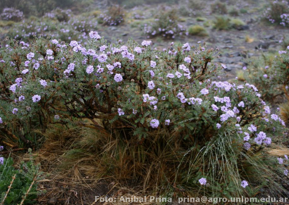 Arbustos de 1-1,5 m de alto, con ramas erguidas, flexibles, pubescentes hacia el ápice; entrenudos de 5-10 mm. Hojas dimorfas, las de los macroblastos de (2-)3-4(-8) mm de largo, 3- partidas, espiniformes, con el lóbulo central de mayor longitud que los laterales; hojas de los braquiblastos de 9-12 x 1-1,5(-3) mm, enteras, subcrasas, obovadas a linear-oblongas, ápice obtuso a subobtuso, con mucrón breve y base cuneada, superficie escabrosa. Monobotrios formados por espigas plurifloras de 3 cm de largo; brácteas florales de 2,5-8(-9) mm de largo, ovadas o lineares, subconnadas, ápice agudo a punzante, a veces acuminadas, margen ciliado. Cáliz tubuloso, 5-dentado, con tubo de 3-4,5 mm de largo, marcadamente 5-costado, dientes de 0,5-3 mm de largo, subiguales, subulados, rígidos y algo recurvos en el ápice, pubescencia de pelos cortos, esparcidos, blanquecinos, especialmente entre las costillas; corola lila, de 8,5-12,5 mm de largo, con pelos suaves y cortos, más o menos erectos, adpresos, desde la mitad superior hasta la base de los lóbulos, fauce con pelos claviformes; gineceo de 5-6,6 mm de largo, ovario con ápice glabro. Clusas de 2,8-3 mm de largo, ápice obtuso, angostándose hacia la base, cara dorsal convexa, castaño oscura, estriada, caras comisurales papilosas, blanquecinas.