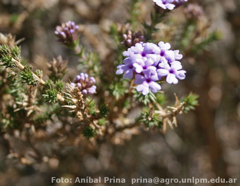Arbustos bajos, postrados, muy ramosos; ramas decumbentes, estriadas, de 10-40 cm de largo, a veces erguidas, híspidas, pelos adpreso-retrorsos. Hojas dimorfas, las de los macroblastos de 3-6(-7,5) x 1,5-5 mm, 3-sectadas, lóbulos desiguales, angostamente oblongos, el central de mayor longitud, rígidos, espinescentes, ápice mucronado, el nervio central prominente en el envés y margen ciliado entero, revoluto, pubescencia escasa de pelos patentes o no; hojas de los braquiblastos de 2,5-3 x 2,5-2,8 mm, glabras subcrasas, 3 ó 2-lobadas, más raramente enteras, ápice obtuso hasta subagudo, por lo general brevemente mucronadas, si el braquiblasto se desarrolla aparecen hojas 3-sectadas. Sinflorescencias en monobotrios, formados por espigas contraídas de 1-1,5(-2,5) cm de largo, 6 ó 12 (18)- floras; brácteas florales de 3-5 mm de largo, enteras, ovadas, en general de ápice agudo, a veces cuspidado, cilioladas, iguales o más breves que el cáliz. Cáliz de 5-7 mm de largo, con pelos breves, patentes, más densos en la mitad superior, dientes del cáliz triangulares o atenuados; corola de 10-13 mm de largo, lila, rosada o púrpura, glabra exteriormente, villosa en el interior, fauce pubescente; estambres superiores sin apéndices conectivales, conectivo no superando la longitud de las tecas; gineceo de 6,5- 8 mm de largo, base del estilo ensanchada. Clusas de 4,5-5,5 mm de largo, glabras, subcilíndricas, rostradas, ápice cubierto por la base del estilo, cara abaxial reticulada, lisa en el ápice, castaño claro, cara adaxial blanca, papilosa.