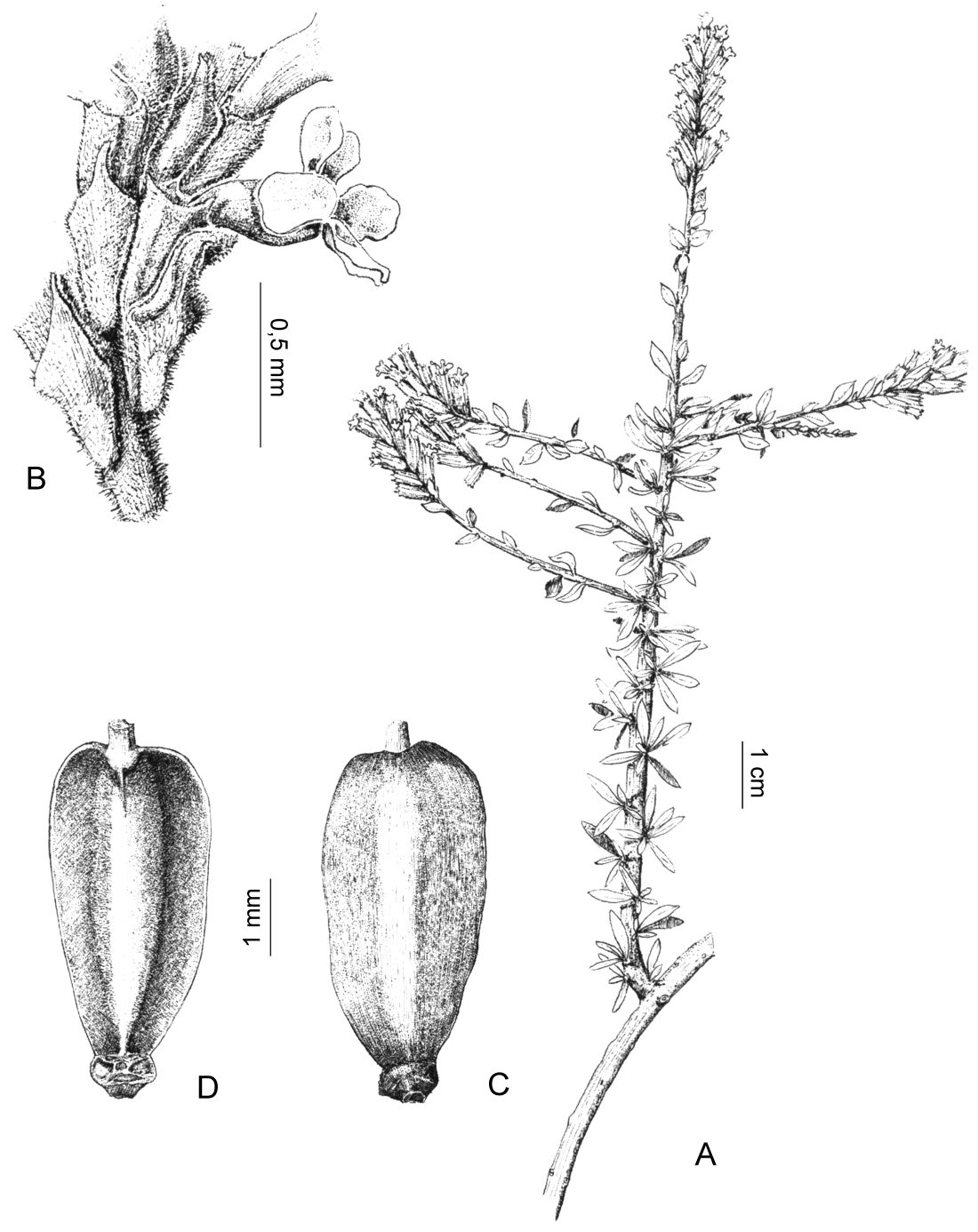 A. Rama florífera. B. Porción de una espiga mostrando una flor y su bráctea. C. Clusa, vista dorsal. D. Clusa, vista ventral.