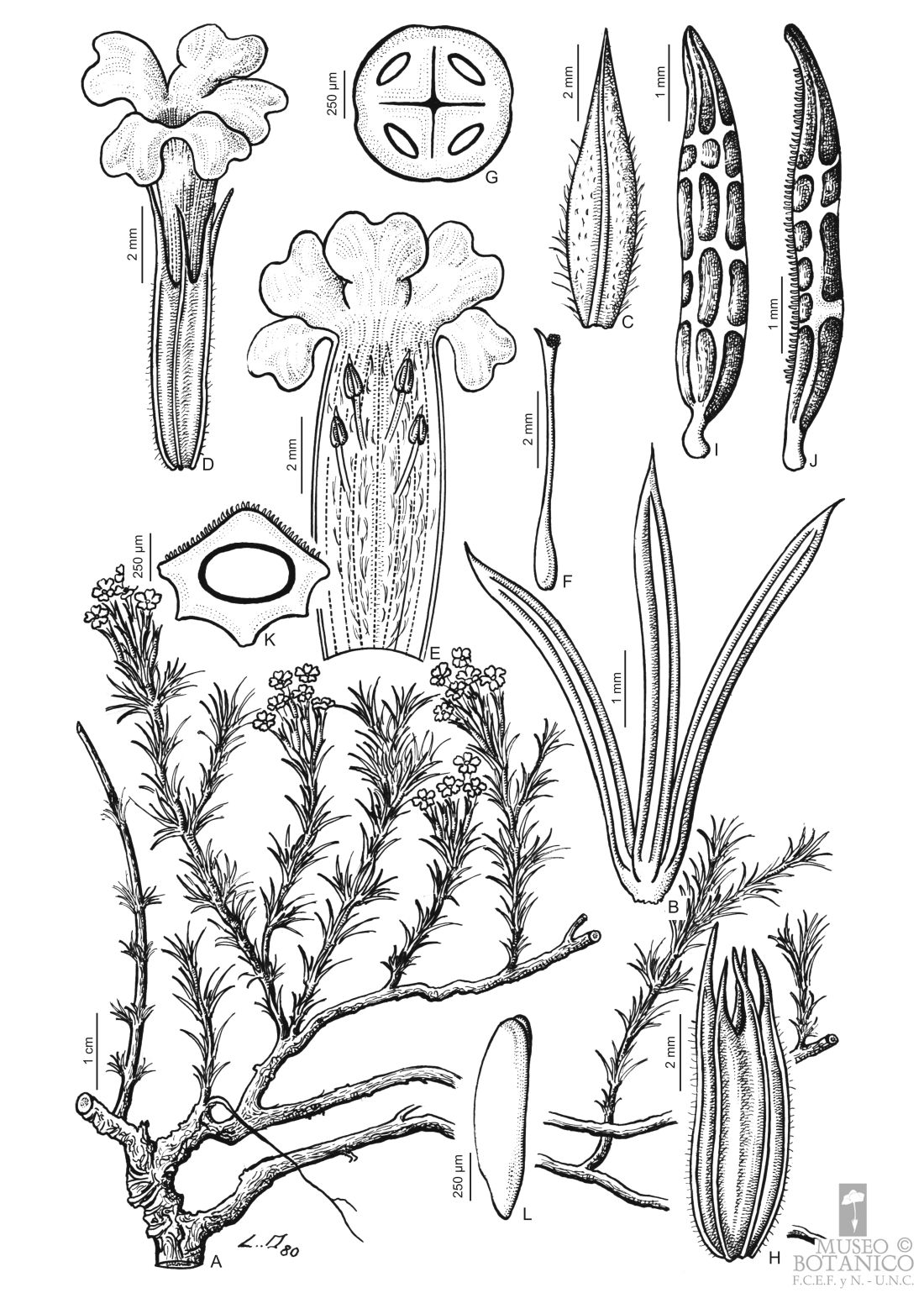 A. Rama. B. Hoja, vista abaxial. C. Bráctea. D. Flor. E. Corola desplegada. F. Gineceo. G. Transcorte por ovario, obsérvese los 4 carpelos biovulados. H. Cáliz fructífero. I-K. Mericarpo, vista dorsal, lateral y transcorte, respect. L. Embrión (de A. T. Hunziker 8047, CORD).