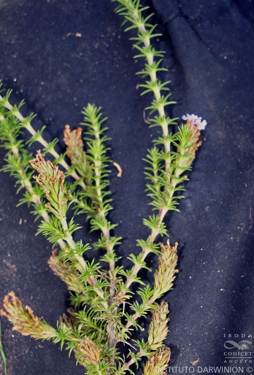Arbustos erguidos o postrados; macroblastos erguidos, a veces decumbentes, pubescencia híspida, variable en densidad. Hojas dimorfas, las de los macroblastos de 4-5 x 2,5-3 mm, profundamente 3-sectadas, connadas, con segmentos de 5-6,5 x 1 mm, angostamente elípticos o lineares, rígidos, pungentes, subiguales, nervio central prominente, margenes engrosados, las hojas de los braquiblastos enteras, 2-lobadas ó 2-3-sectadas, más pequeñas que las anteriores, con pelos simples y glandulares. Sinflorescencias en monobotrios, formados por espigas alargadas, de 2-3 cm de largo, hasta 30-floras; brácteas florales de 5- 7,5 x 1,5-2 mm, enteras, ovales, pungentes, pubescentes y con pelos largos y rígidos en el margen. Cáliz de 6,5-8 mm de largo, dientes de 0,5-1 mm de largo, subiguales, pungentes, pelos simples y glandulares; corola lila de 10-12,5 mm de largo, glabra exteriormente, tubo corolino piloso, fauce glabra; estambres superiores sin apéndices conectivales, conectivo no superando la longitud de las tecas; gineceo de 6,5-8 mm de largo, base del estilo ensanchada. Clusas de 3,5-4 mm de largo, glabras, ápice redondeado, a veces brevemente rostrado y cubierto por la base del estilo, cara abaxial reticulada, castaño rojizo, cara adaxial casi plana, papilosa, blanquecina.