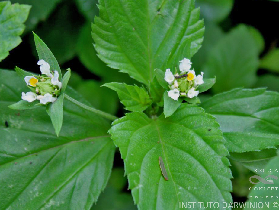 Arbustos apoyantes hasta de 2 m de alto, inermes, con ramas jóvenes, tetrágono-sulcadas, adpreso-estrigosas; entrenudos de 2-6(-8) cm de largo. Hojas opuestas, pecioladas; pecíolos de 2-20 mm de largo; láminas de 1,2-12 x 0,6-4,7 cm, membranáceas, ovadas a angostamente ovadas, marcadamente subuladas, de margen entero hacia la base y el resto finamente crenado-serrado, venoso-impresas en el haz, glabrescentes, densamente incano-pubescente a velutinas y venoso-prominentes en el envés. Florescencias en cabezuelas axilares densas, solitarias o geminadas, pedunculadas, subovoides, que se alargan algo durante la fructificación; pedúnculos gráciles, de 1-5,3 cm de largo, adpreso-pubescentes; brácteas basales de 6-11(-14) x 2-4 mm, imbricadas, ovadas, oval-oblongas a angostamente elípticas, comunmente cuspidado-rostradas, las restantes menores. Cáliz de 1-1,5 mm de largo, de borde truncado y ciliado, seríceo; corola blanca con garganta amarilla, tubo de 3-6 mm de largo, algo ventricoso, pubérulo exteriormente. Frutos esféricos o subesféricos, subcarnosos, de 1,5-2 mm de diámetro, con 1 pirena 2-locular, 2-seminada y una fosa basal que, a veces, se continúa en un surco interlocular.