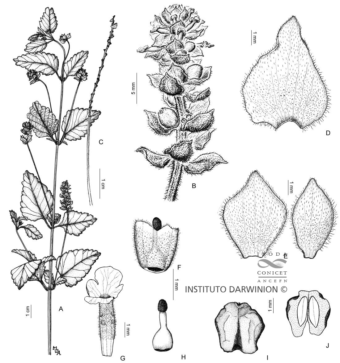 A. Rama. B. Florescencia. C. Raquis. D. Bráctea basal, cara abaxial. E. Brácteas internas, cara abaxial. F. Cáliz y gineceo. G. Corola. H. Gineceo. I. Pirena, vista adaxial. J. Pirena, corte longitudinal.