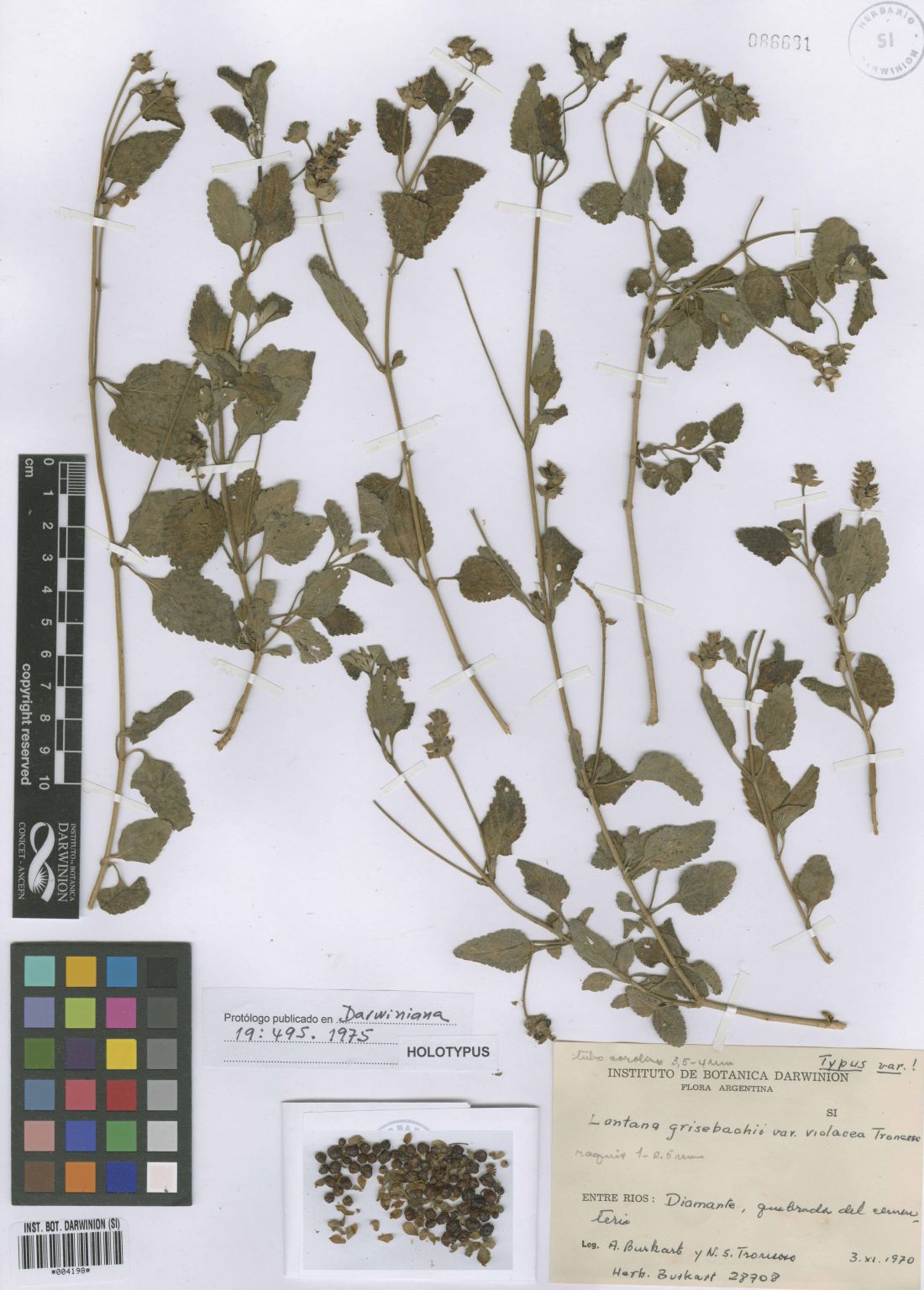 Observaciones: El ejemplar citado por Sprengel en la descripción original de Lippia megapotamica, depositado en B, está actualmente destruido. Se consultaron los herbarios de HAL, HBG, UVM y W y no se halló material original estudiado por el autor en ninguno de ellos, por este motivo se procedió a la neotipificación de este nombre.