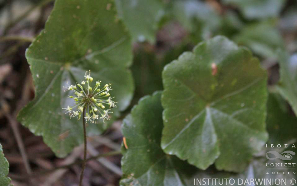 Plantas perennes, delicadas, subglabras; tallos delgados, rastreros o escandentes. Hojas paláceas, pecíolos de 4-20(-30) cm de largo, diminutamente hirsuto, principalmente hacia arriba; lámina orbicular-reniforme, de 3-13 cm de diámetro; 7palmatinervada, 7-9-lobada, glabra o escasamente pilosa en la cara superior, hirsútula sobre las venas de la cara inferior; lóbulos obtusos, generalmente triangular-obtusos, a veces redondeados, crenados, seno basal profundo, alcanzando el pecíolo. Umbelas simples, 50-150-floras, pedúnculo superando la hoja opuesta, hirsuto a diminutamente hirsuto, por lo menos en la porción distal. Flores sobre pedicelos de 4-8 mm de largo, patentes y reflejos, pétalos blancos o blanco-verdosos, estilos ca. 0,5 mm en antesis, acrecentes, hasta 1,2 mm en el fruto. Frutos comprimidos, transelípticos, de 1-1,5 × 2 mm con base emarginada; mericarpios de sección romboidal con costilla dorsal y laterales marcadas; estilos, algo cónicos en la base, largos, reflejos, superado el ancho de los mericarpios; epicarpio liso, amarillento.