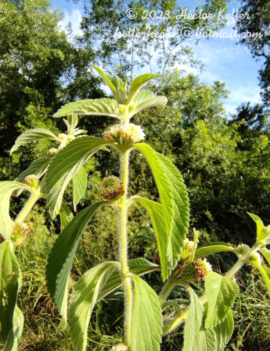 Sufrútices de 20-100 cm de alto; xilopodio grueso, leñoso; ejes hirsutos, con pelos simples, blanquecinos, hasta de 2 mm de largo; entrenudos de 2,5-4 cm de largo. Hojas con pecíolos de 6- 10 mm de largo; láminas de 4,5-12 x 2-5 cm, ovadas, base cuneada, ápice agudo, margen aserrado, seríceas en ambas caras, con pelos largos, blanquecinos. Sinflorescencias en pleiobotrios homotéticos frondosos, nudos proximales estériles, con 8-12 nudos apicales fértiles; florescencias en espigas cilíndricas, compactas, hasta de 2,5 cm de de largo; pedúnculos de 5 mm de largo; brácteas de 5,4 x 4,1 mm, anchamente ovadas, acuminadas, híspidas. Cáliz de 1,7 mm de largo, globoso, hendido hasta la mitad; corola infundibuliforme, ca. 7 mm de largo, blanco-amarillenta. Fruto esférico de 1 mm de diámetro; clusas con paredes lisas.