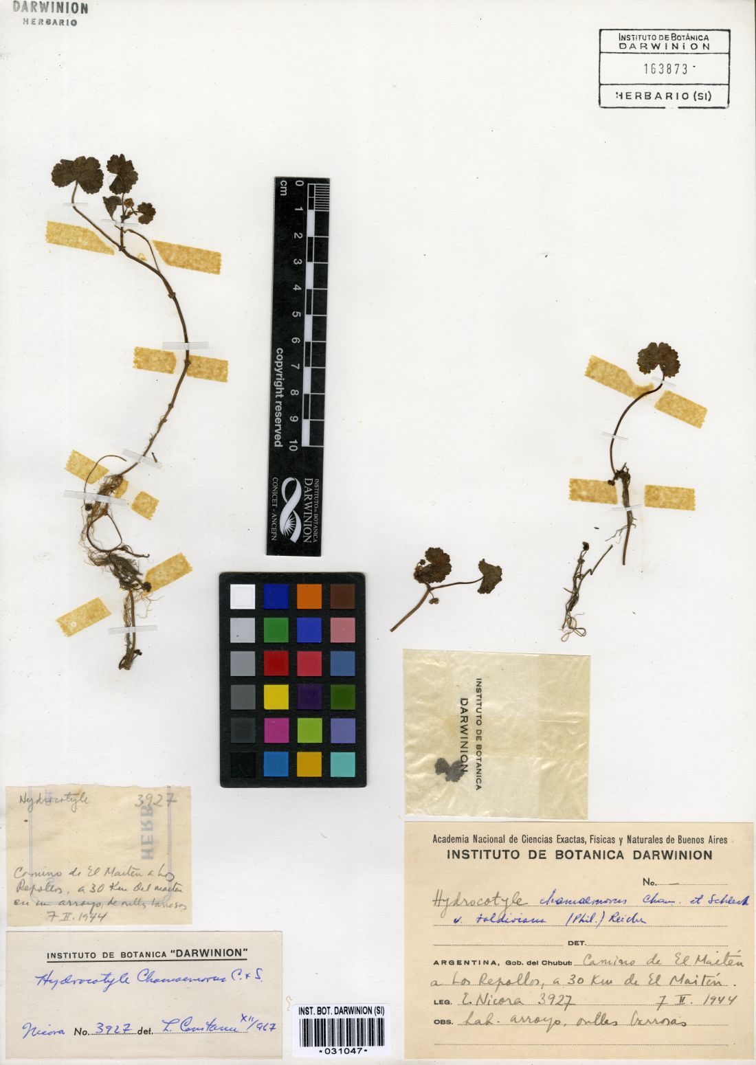 Observaciones: Especie de distribución amplia, en diversos ambientes, es morfológicamente variable, particularmente en los caracteres foliares sobre los que se basan los nombres de Philippi que se presentan en la sinonimia. Fueron evaluados como material original de Hydrocotyle chamaemorus cuatro ejemplares depositados en P que se ajustan al protólogo en datos de la etiqueta. Sin embargo, sólo en uno de ellos, aquí designado como lectotipo, el material coincide con la descripción de Chamisso, y con el uso corriente de este nombre. Los restantes ejemplares (P 00115354!, P 00115355!, P 00115356!), con hojas estrigosas y frutos castaños no maculados, pueden asignarse a H. indecora DC.