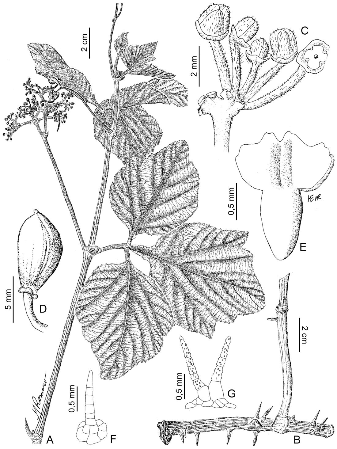 A. Rama florífera. B. Detalle del tallo con aguijones. C. Porción de inflorescencia. D. Fruto. E. Embrión. F. Tricoma tabicado. G. Tricoma fasciculado. [Extraído de Fl. Paraguay 30: 20, fig. 6. 1999].