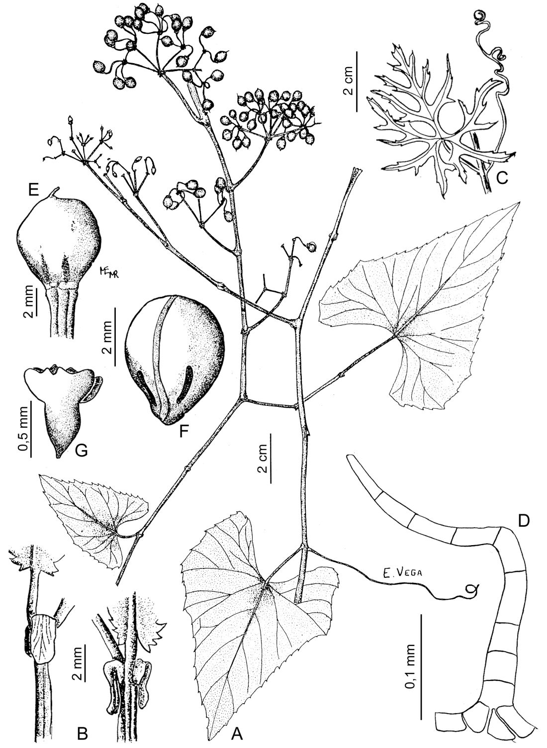 Liana con raíces adventicias aéreas; tallos jóvenes cilíndricos tornándose 4-angulares, delgados, estriados, glabros a pubérulos con tricomas simples; tallos maduros de sección 2-lobulada por dos cilindros vasculares con un surco longitudinal profundo entre ambos, lignificados, glabros; corteza parda, estriada a irregularmente reticulada; zarcillos simples a 2-ramificados. Hojas simples con pecíolos de (0,8-)1,5-4,5 cm de largo; láminas ovadas o triangulares, raro 3-lobadas o palmatipartidas, de (2-)3-12(-23) × (1-)1,4-10,5(-17,4) cm, base cordada, ápice agudo, el margen aserrado, glabras o pubescentes, papiráceas o carnosas; estípulas oblongas, de 2-5 mm de largo, reflexas, auriculadas, ciliadas, caducas. Inflorescencias de (1,4-)2-5(-7,4) cm de largo; pedúnculos de 1-4(-5) cm de largo; pedicelos de 2-7 mm de largo. Flores de 3 mm de largo, amarillas o verde-amarillentas; cáliz con lóbulos triangulares; corola de 1,5-2,5 mm de largo, glabra; disco nectarífero 4-lobado, amarillo o verdoso. Fruto una baya globosa, de 4-6 mm de diámetro, apiculada, violácea a negra. Semilla 1, obovoide, de 4-10 mm de largo, lisa.