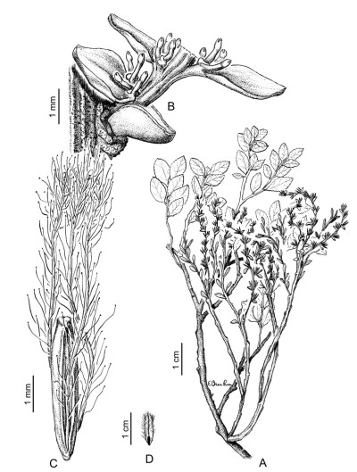 Planta de 10-35 cmde diámetro; haustorio sin engrosamiento, el hospedador tiene la rama ensanchada en el lugar de inserción; tallos angulosos, alados, verrugosos, glabros, amarillos a verdosos. Hojas sésiles dimorfas, caducas; las inferiores con láminas ovadas, de 2,5-3,5 × 1,5-3,5 mm, cuculadas, ápice coriáceo, las superiores con láminas lineares, de 4-7 × 1-2 mm, base atenuada, ápice acuminado. Inflorescencias en espigas de 1,5-8 cm de largo, laxas; yemas de las inflorescencias por encima de las vegetativas; brácteas de las inflorescencias elementales elípticas, cuculadas de 3 × 1,5 mm. Inflorescencia elemental estaminada 2-flora; flores cortamente pediceladas, estambres 2, anteras amarillas o castañas. Inflorescencia elemental pistilada 4-6-flora; flores cortamente pediceladas verdes con estilo rojizo. Fruto elipsoide de 3-3,5 × ca. 0,7 mm; setas maduras de 5-10 mm de largo.