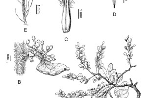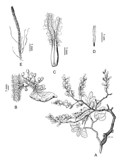 Planta de 20 cm de diámetro; haustorio engrosado en la base apenas perceptible hasta muy notable; talloslisos, glabros, grisáceos o castaños, lenticelas prominentes. Hojas con pecíolo breve; láminas obovadas, de 5-12 × 2-5 mm, base atenuada, ápice truncado, glabras. Inflorescencia de 1-9 cm de largo; raquis pubescente; yemas de las inflorescencias naciendo por encima de las vegetativas. Inflorescencias elementales con brácteas foliáceas obovadas a orbiculares, de 3-4 × 2-2,5 mm planas, margen sinuoso, ciliado, recaulescentes hasta el extremo del eje de la inflorescencia elemental; flores dispuestas sobre el eje de la bráctea. Inflorescencia elemental estaminada (2-)3-4-flora; estambres 3. Inflorescencia elemental pistilada 3-6-flora; flores sésiles; perianto verde; ovario con disco poco prominente en la parte superior rodeando al estilo. Fruto cilíndrico o elipsoide, de 2-3 × 0,6 -1,3 mm, glabro, castaño; setas maduras de 10-30 mm de largo, plumosas en la base, ápice desnudo claviforme, recto, cubierto de papilas, canela.