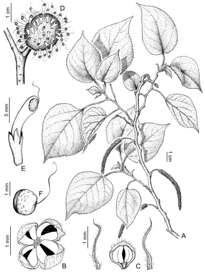 Árbol de 8-15 m de alto, de corteza grisácea; ramas jóvenes subtomentosas, hirtelas o pubérulas, con peridermis castaña. Hojas con láminas ovadas, elípticas a cordiformes, de 5-20 × 4-13 cm, base cordada, redondeada o subcuneada, ápice acuminado a subagudo, margen crenado a serrado-dentado, cara adaxial hispídula y áspera al tacto, cara abaxial pubescente o subtomentosa en las venas, con 5-9 pares de venas laterales, cartácea; pecíolo de 2-9 cm de largo, subtomentoso; estípulas de 0,5-1,5 cm de largo, puberulentas, caducas. Inflorescencias estaminadas en espigas de 3-10 cm de largo; pedúnculo de 1-2,5 cm de largo, puberulento a tomentoso. Flores estaminadas con perianto de 1,5-2 mm de largo, puberulento; estambres con fi lamentos de 2-3,5 mm de largo, anteras de 0,6-0,8 mm de largo; pistilodio de 0,5 mm de largo, a veces ausente; brácteas subuladas interflorales de 1-5 mm de largo. Infl orescencias pistiladas capitadas, solitarias, de 1-1,2 cm de diámetro, puberulentas; pedúnculo de 0,3-1,5 cm de largo. Flores pistiladas con perianto de 1 mm de largo, 4-dentado; ovario con estilo lateral; estigma de 7-10 mm de largo; brácteas interflorales clavadas a subpeltadas. Fruto subgloboso, de 1,5-3 cm de diámetro; estípite de 0,3-0,6 cm de largo, rojizo. Semilla ovoide, de 2-2,5 mm de largo.