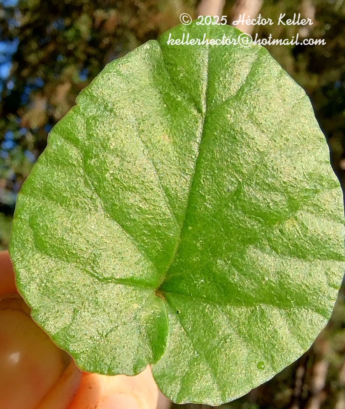 Hierba perenne; tallo subterráneo, tuberoso, simple o ramificado, de 1,5-8 cm de largo, glabro y marcadamente nodoso; tallo aéreo simple, 2-3-furcado, con látex. Hojas con pecíolo de 4-14 cm de largo, pubescentes; láminas cordadas, de 4-8 × 3-7 cm, base cordiforme con un seno ancho, ápice obtuso, margen entero o ligeramente crenado, cara adaxial híspida a glabrescente, cara abaxial pubescente o glabra, papiráceas, con 2-5 pares de nervios secundarios; estípulas deltoideas, de 2-4 mm de largo, pilosas, persistentes. Inflorescencias en cenanto discoide, estrellado o rómbico, de 0,5-1,6 cm de diámetro, superficie externa híspida, especialmente en los ángulos, margen con 2-3 fi las de brácteas ovado-oblongas, de 0,5-1 mm de largo, violáceas; pedúnculo de 2-4 cm de largo, densamente híspido, violáceo. Flores estaminadas con perianto 2-lobado; estambres 2, anteras subglobosas, filamentos incurvos. Flores pistiladas con ovario de 0,7-1 cm de largo; estilo lateral filiforme, de 0,8-1 mm de largo, estigma 2-fido. Fruto drupáceo, exocarpo delgado y algo carnoso, dividiéndose en dos valvas a la madurez; endocarpo crustáceo, finamente tuberculado, subtetraédrico de 1-1,2 mm de largo. Semillas de 0,9-1,2 mm de diámetro.