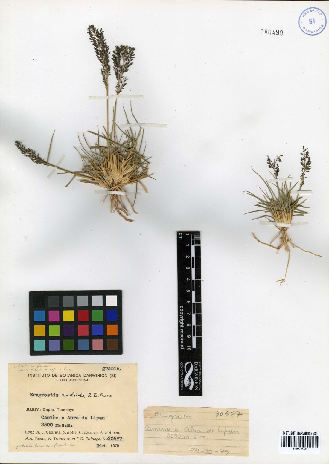 Material Tipo: Argentina. Jujuy. Moreno, “in montibus saxosis apreicis siccis,” 3500-3700 m s.m., 15 Dic 1901, R. E. Fries 924 (lectotipo, UPS!, designado por P. M. Peterson & I. Sánchez Vega, Ann. Missouri Bot. Gard. 94: 753. 2007; isolectotipos, BAA!, CORD, S, US-2891444!, fragmento ex S).