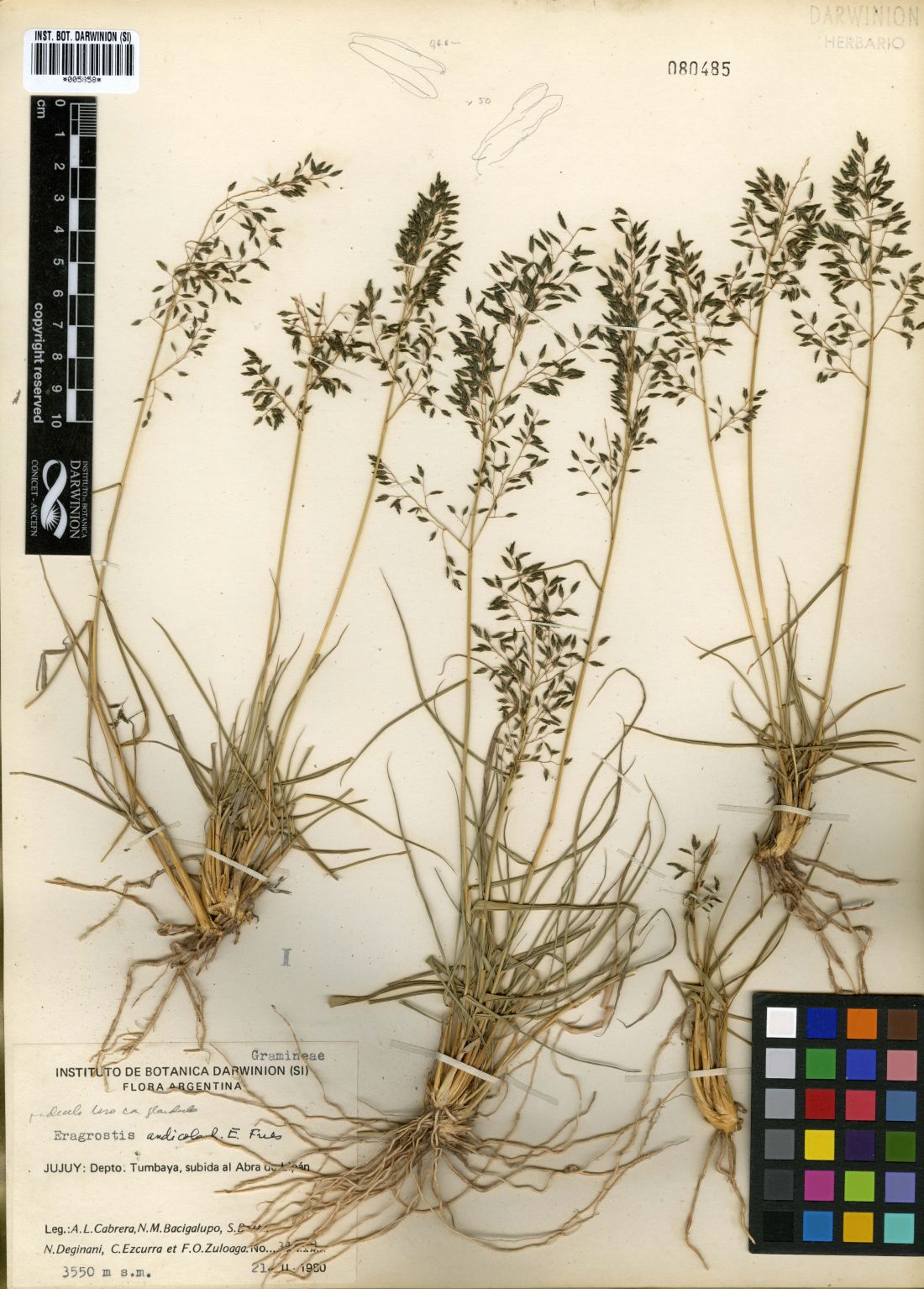 Observaciones: Esta especie podría confundirse con Eragrostis lugens. No obstante, los caracteres diagnósticos más importantes para ésta son sus pedicelos con una única banda de glándulas cerca de la porción medial, las láminas con pequeñas glándulas oblongas esparcidas y localizadas arriba de las venas abaxiales, las vainas y las láminas con tricomas tiesos de base papilosa, la cariopsis finamente reticulada y sin surco ventral aparente o éste poco profundo.