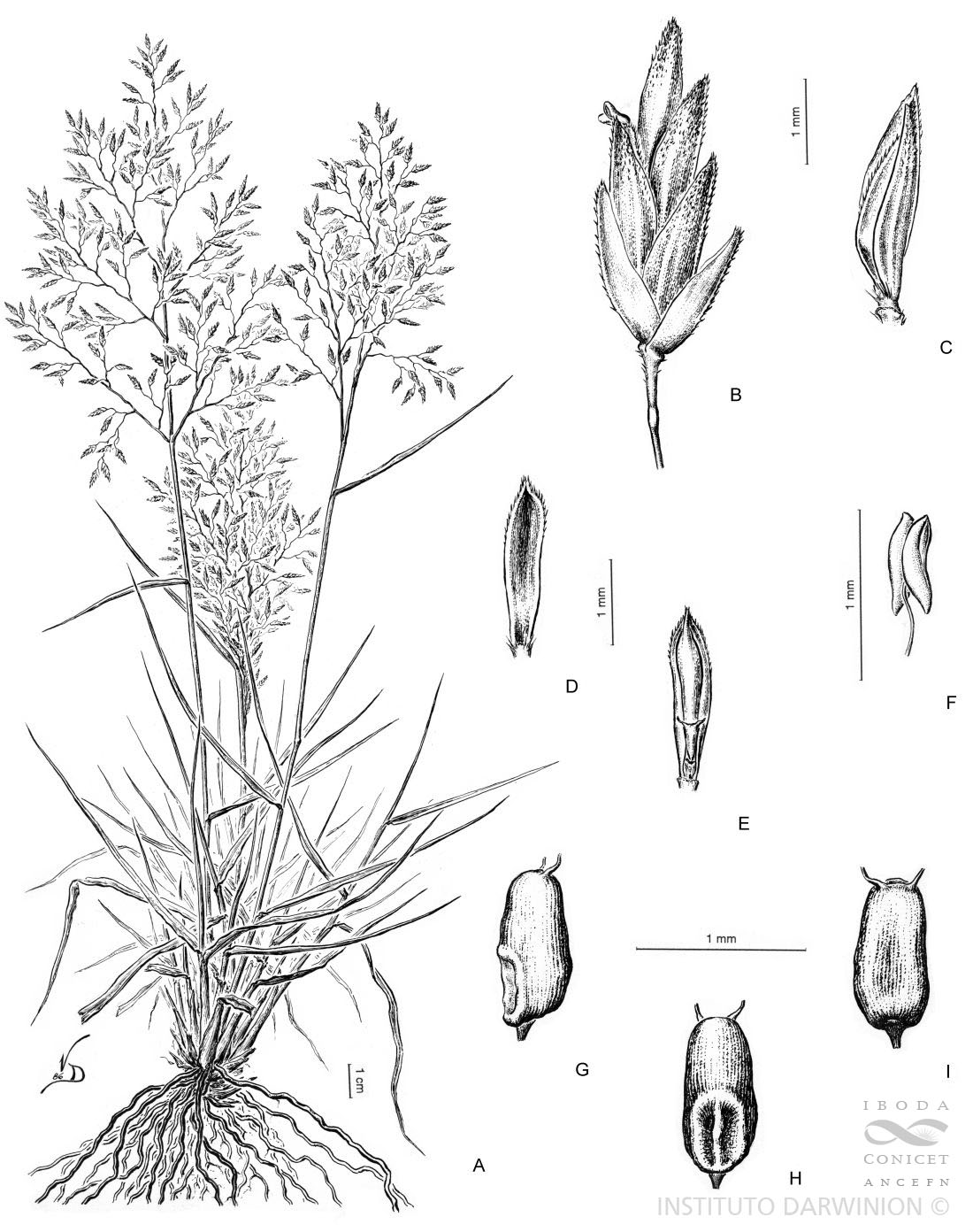 Plantas perennes, cespitosas; cañas de 13-50 cm de alto, erectas; vainas tan o más largas que los entrenudos inferiores, a veces con pequeñas glándulas oblongas en las venas, ciliadas distalmente o glabras, a veces con los tricomas de base papilosa, hasta de 4 mm de largo, tiesos; lígulas de 1-1,5 mm de largo, ciliadas; láminas (3-)5-12 cm x 1,5-3 mm, planas a involutas, fuertemente divaricadas, ocasionalmente con pequeñas glándulas oblongas esparcidas y localizadas arriba de las venas abaxiales, adaxialmente escabriúsculas, abaxialmente pilosas a glabras, los tricomas hasta de 4 mm de largo. Inflorescencias de (6-)9-20 x 5-10 cm, oblongas, abiertas, ramificaciones primarias de 2-8 cm de largo, a veces con bandas de glándulas por debajo de las bases de las ramificaciones, una o dos por nudo, las ramificaciones divergentes en ángulos de 45º-90° con relación al raquis; ramificaciones secundarias compuestas de espiguillas levemente superpuestas; pulvínulos glabros a ligeramente ciliados; pedicelos de 1,8-5 mm de largo, divaricados a la madurez, a veces con una banda de glándulas cerca de la porción medial, engrosados, escabrosos. Espiguillas de 4-9 x 1,8-2,2 mm, 3-12-floras, ovado-lanceoladas, plomizas a purpúreas; raquilla algo aplanada con unos pocos tricomas cortos, esparcidos principalmente cerca de la base; desarticulación acrópeta, las glumas caen primero que las lemmas, las páleas persistentes; glumas de 1,2-2,4 mm de largo, subiguales, ovadas a lanceoladas, membranáceas, generalmente purpúreas y con márgenes hialinos; gluma inferior de 1,2-2 mm de largo, más angosta que la superior; gluma superior de (1,8-)2-2,4 mm de largo; lemma de 2-2,8 mm de largo, ovada, membranácea, plomiza, nervios laterales inconspicuos, escabriúsculos a lo largo de las carinas y cerca del ápice, ápice obtuso, ocasionalmente mucronado, el mucrón de menos de 0,2 mm de largo; pálea de 1,2-2,4 mm de largo, más corta que la lemma, membranáceas, escabriúsculas, ápice obtuso a truncado; estambres 3, anteras de 0,4-0,6 mm de largo, amarillentas o purpúreas; cariopsis de 0,5-1 mm de largo, rectangular-prismática en sección transversal, lados subiguales en sección transversal, sin un surco ventral, estriada, finamente reticulada.